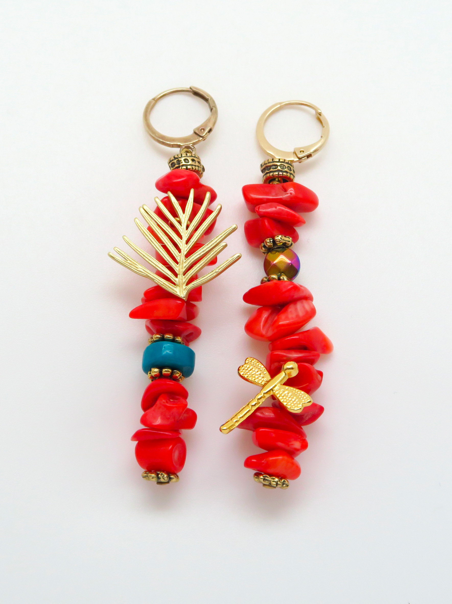 La pierre utilisée est du corail bambou orange et ses pampilles sont en hématite et turquoise.