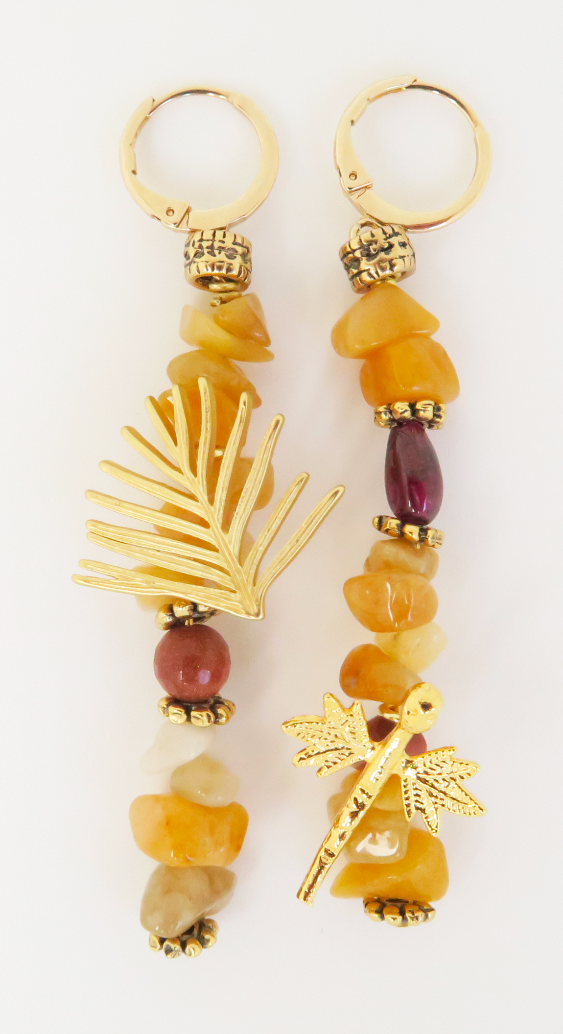 Boucles d’oreilles avec chips de pierres semi-précieuses et pampilles en laiton doré.