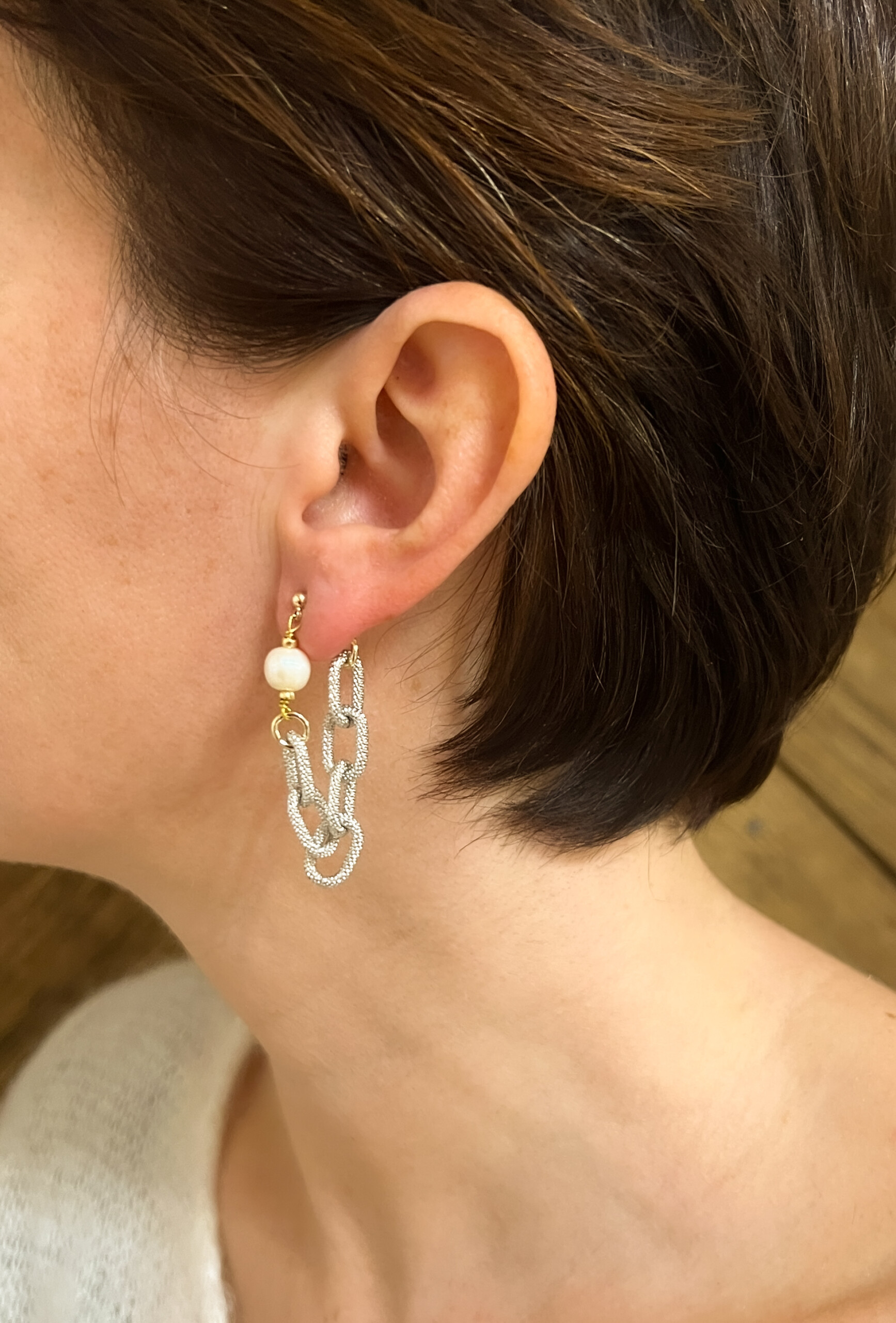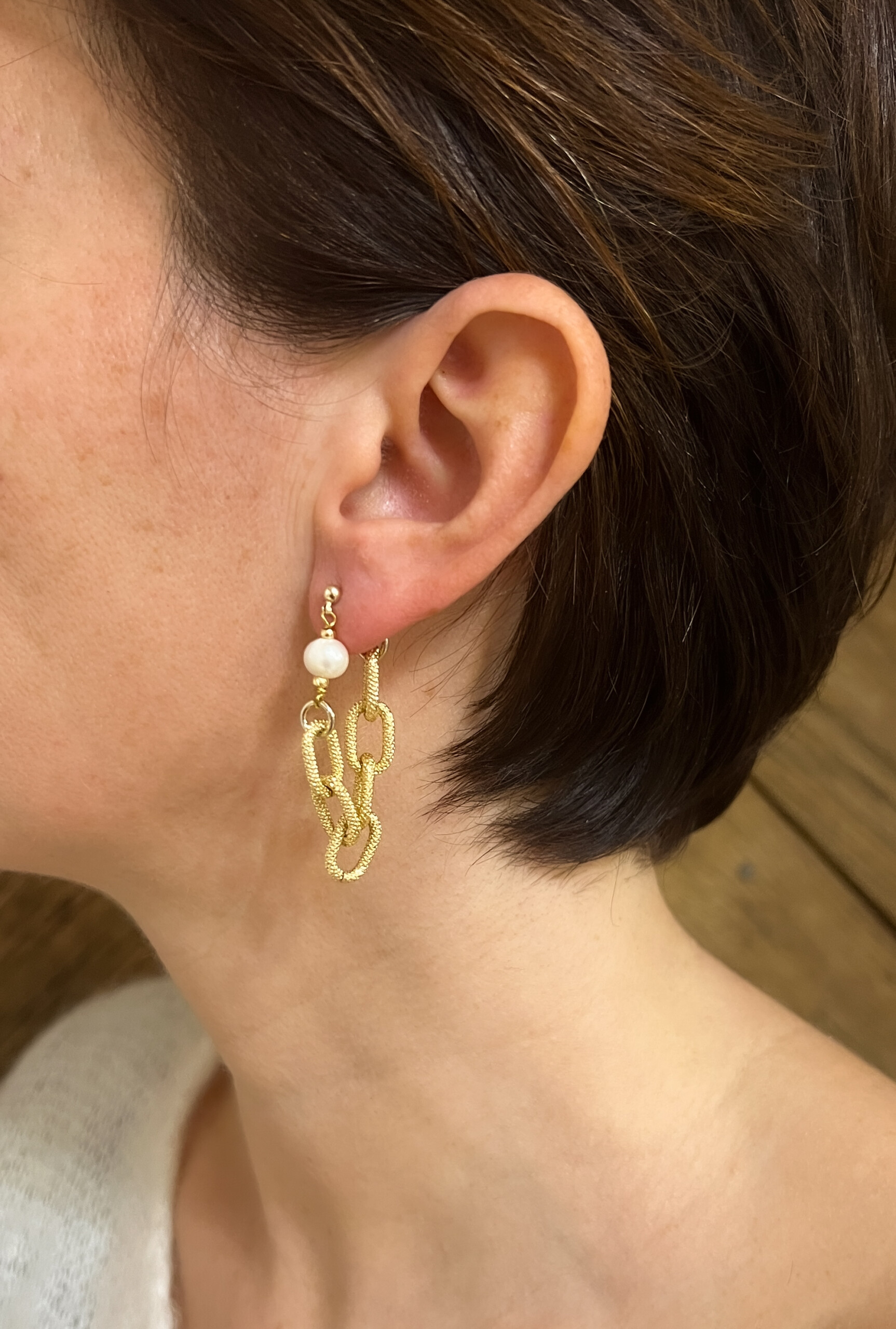 Boucles d’oreilles avec perle d’eau douce blanche et chaine en argent ou doré.