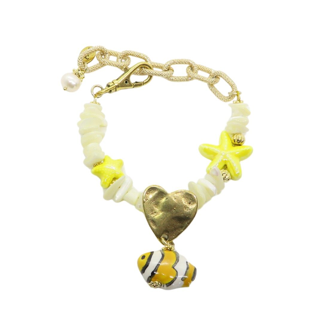 Bracelet ajustable avec pampilles en céramique et nacre blanche, chaines et perles en métal doré.
