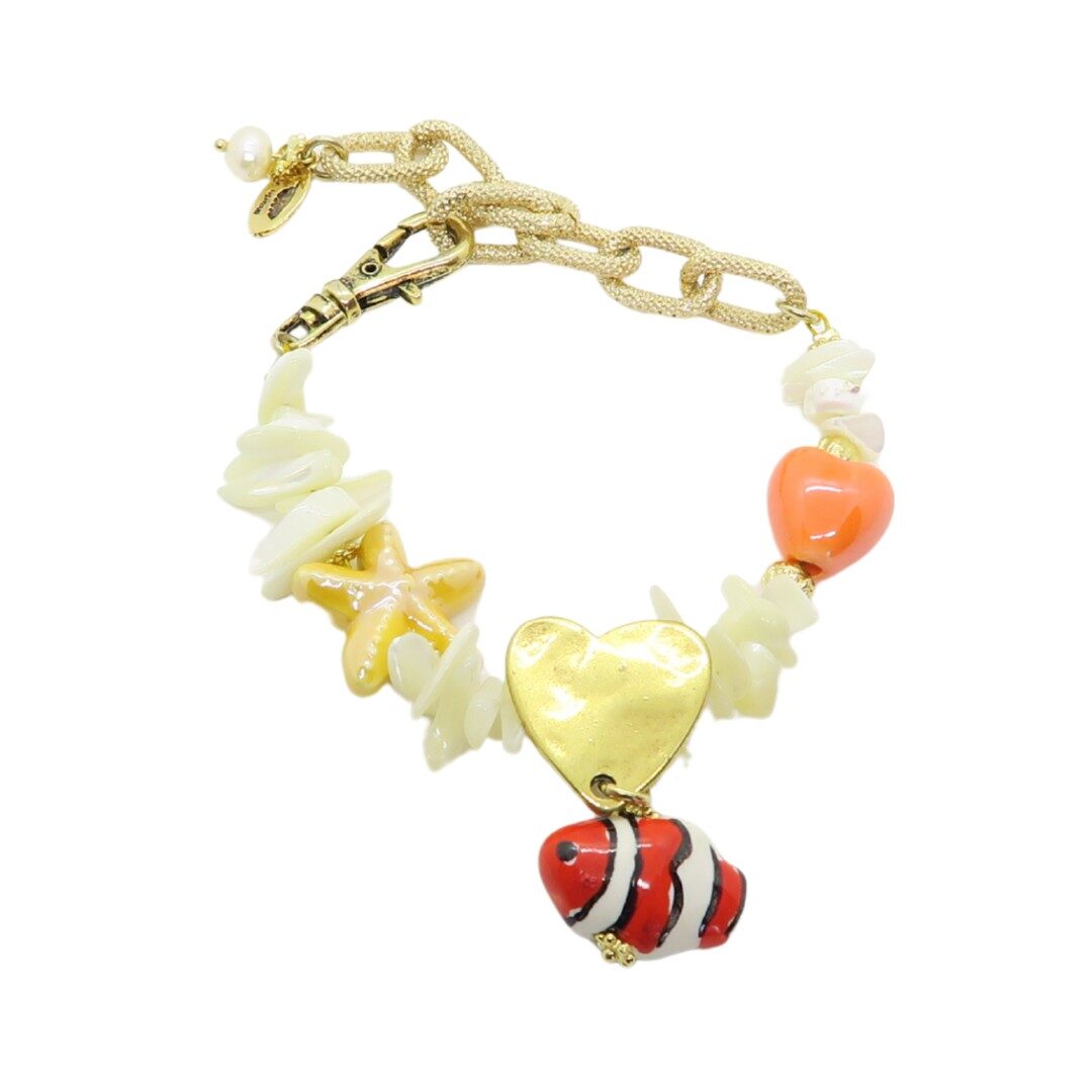 Bracelet ajustable avec pampilles en céramique et nacre blanche, chaines et perles en métal doré.