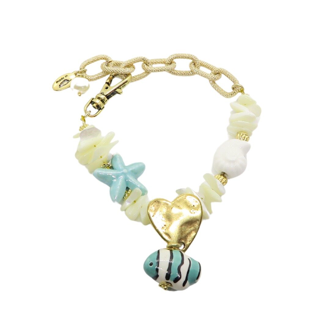 Bracelet ajustable avec pampilles en céramique et nacre blanche, chaines et perles en métal doré.