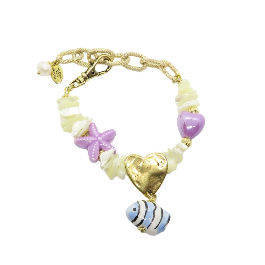 Bracelet ajustable avec pampilles en céramique et nacre blanche, chaines et perles en métal doré.