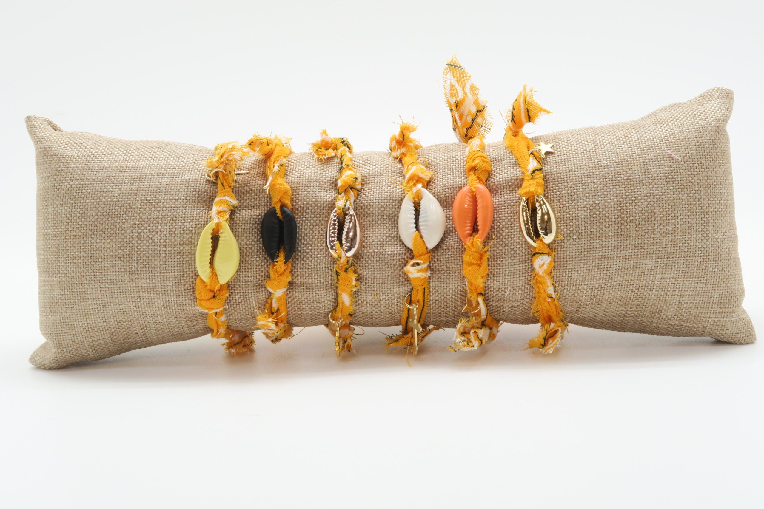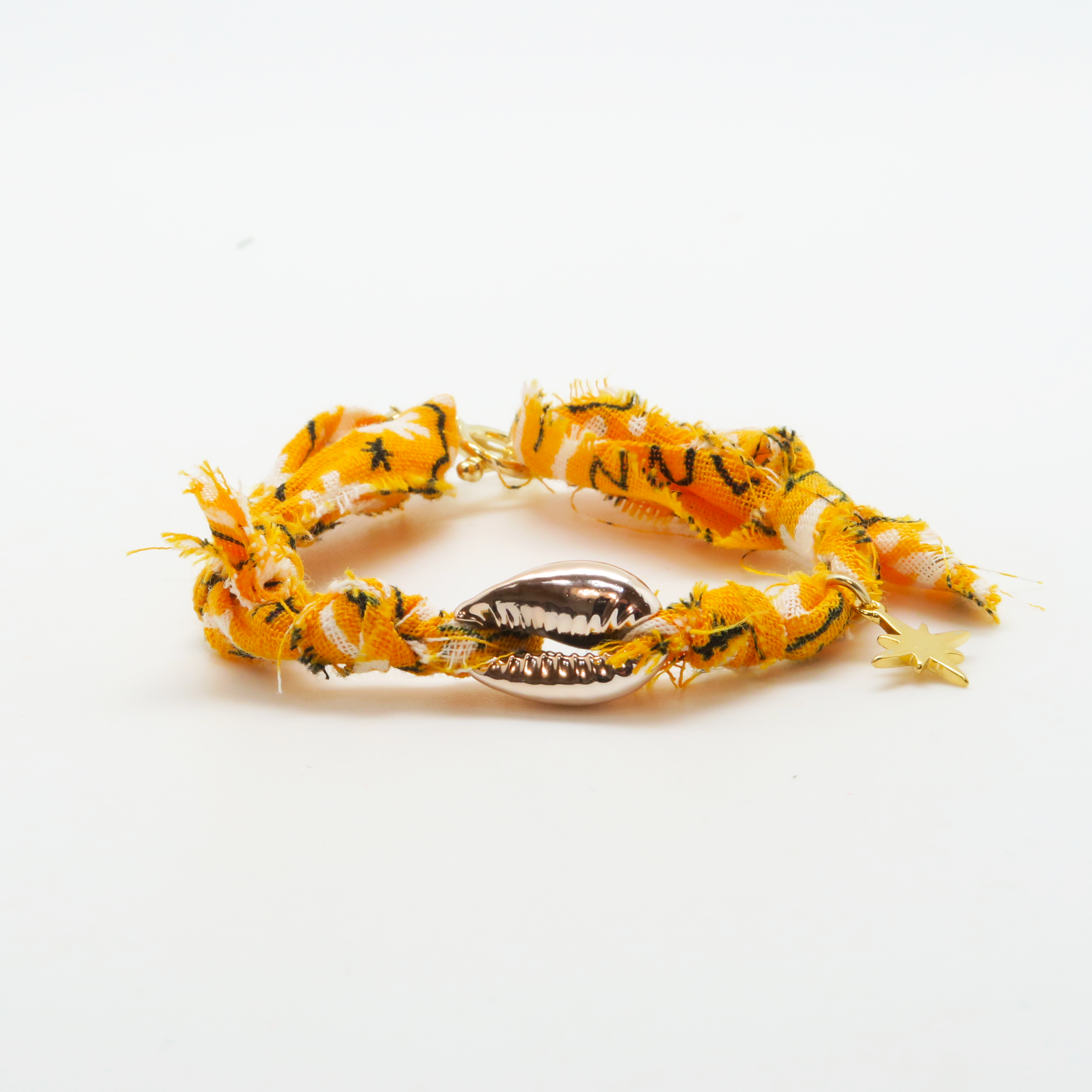 Bracelet ajustable en Bandana jaune et cauri. Pendentif au choix. Le bracelet peut se porter en chaine de cheville également.