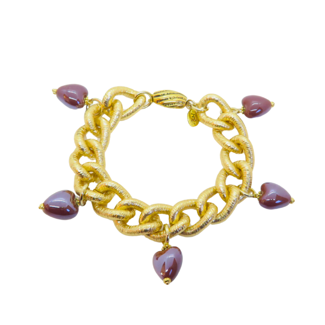 Bracelet avec grande chaine dorée et coeurs en céramique.