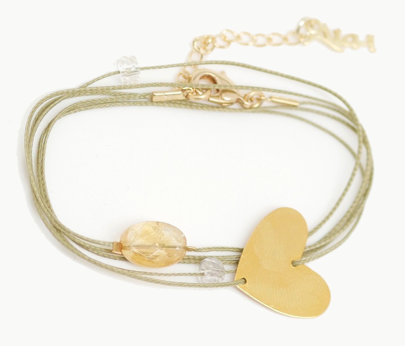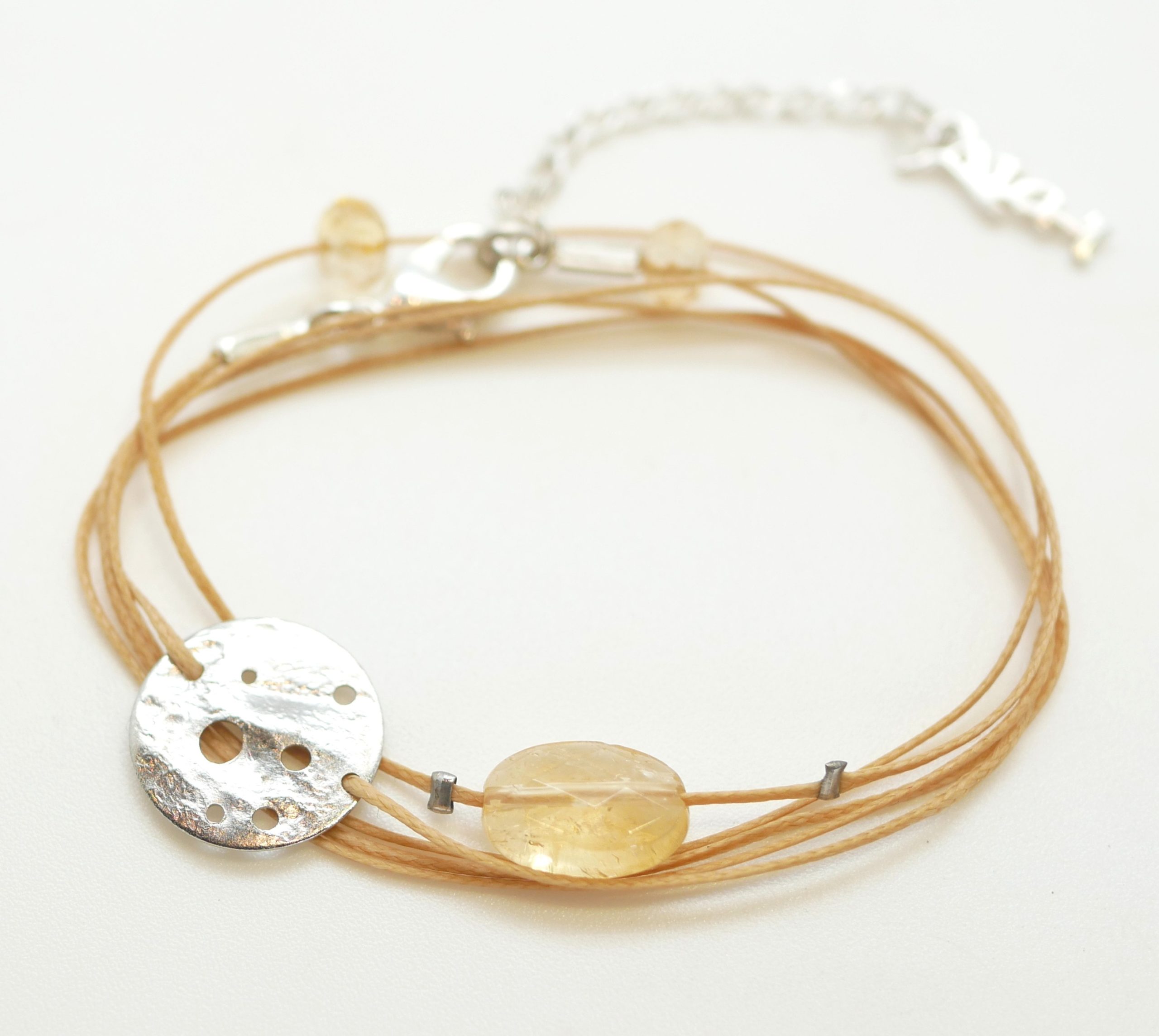 Bracelet cordon cinq tours avec pierre semi-précieuse. Pastille ou coeur au choix. Couleur présentée: citrine sur argent.