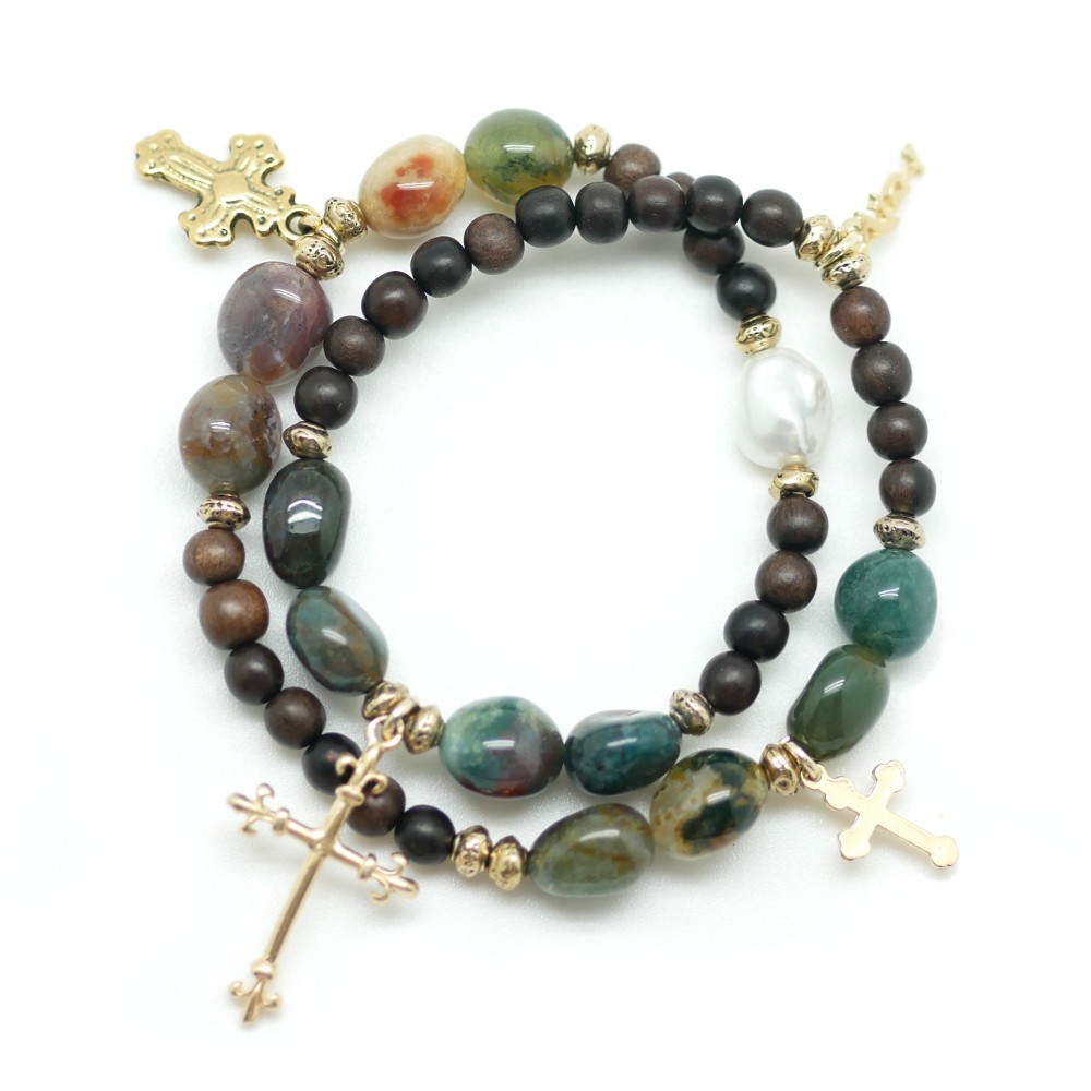 Bracelet élastique double tour en bois exotique et pierres semi-précieuses.