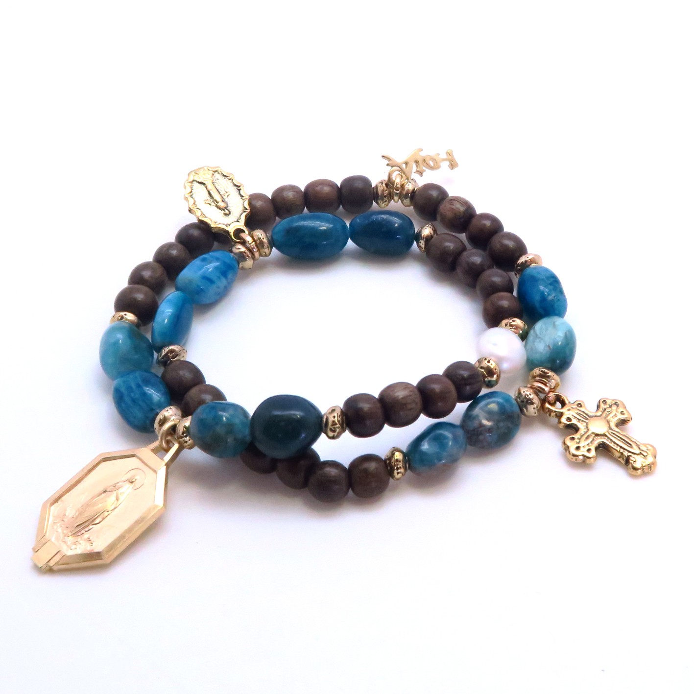 Bracelet élastique double tour en bois exotique et pierres semi-précieuses.