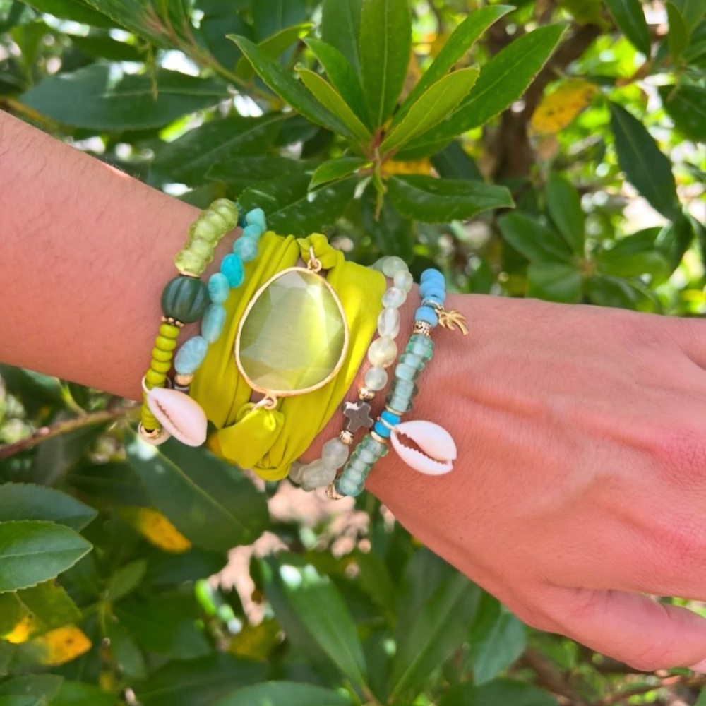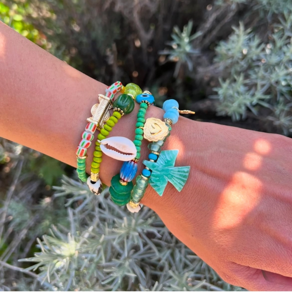 Bracelet élastique Babacar avec perles africaines en verre, résine ou céramique, métal doré.