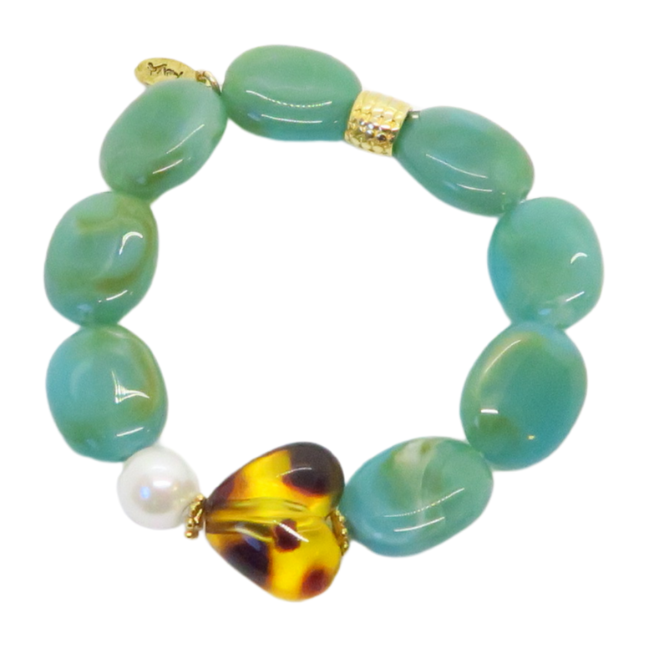 Bracelet élastique en perles de résine colorée, avec une perle cœur léopard et perle de culture fantaisie.