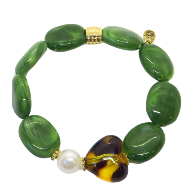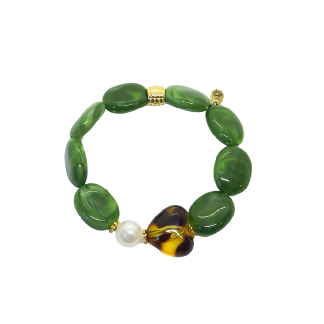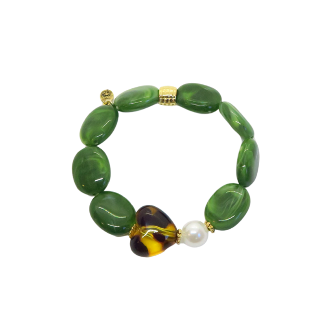 Bracelet Gabrielle perles vert olive et cœur léopard