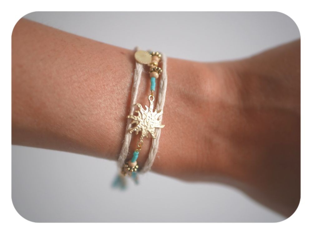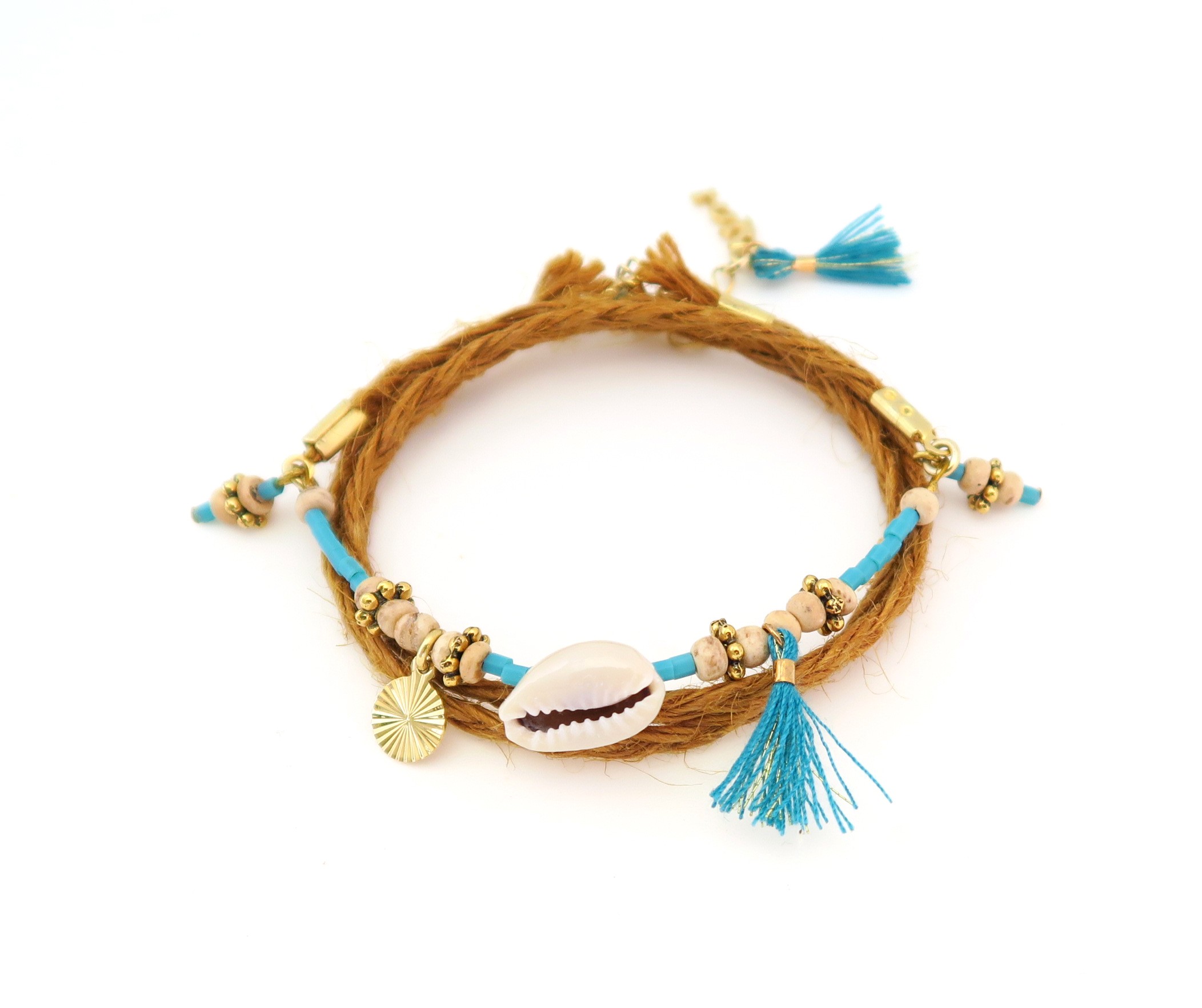 Bracelet en corde avec perles japonaises, bois exotique et petits pompons. (trois tours ajustable)