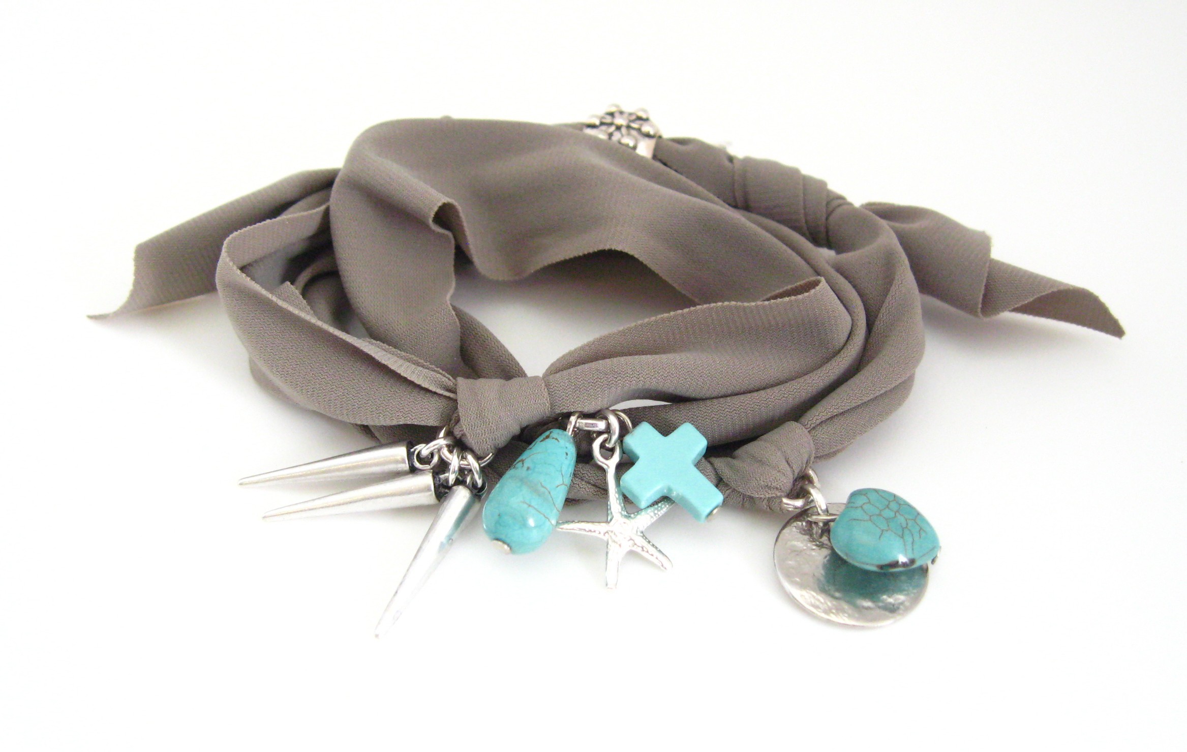 Coloris présenté: lycra taupe avec pierres semi-précieuses turquoise.