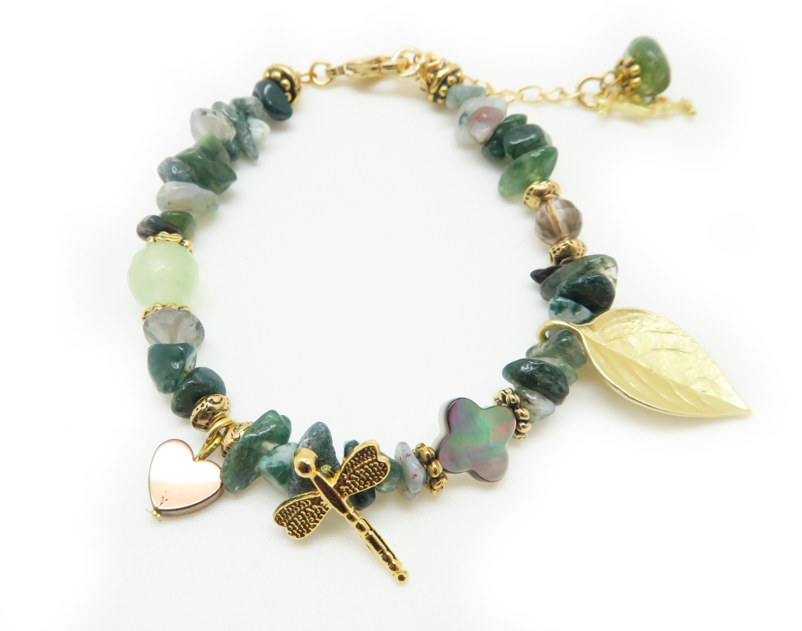 La pierre utilisée pour ce bracelet est de l’agate mousse et ses pampilles sont en nacre, quartz fumé, prehnite…