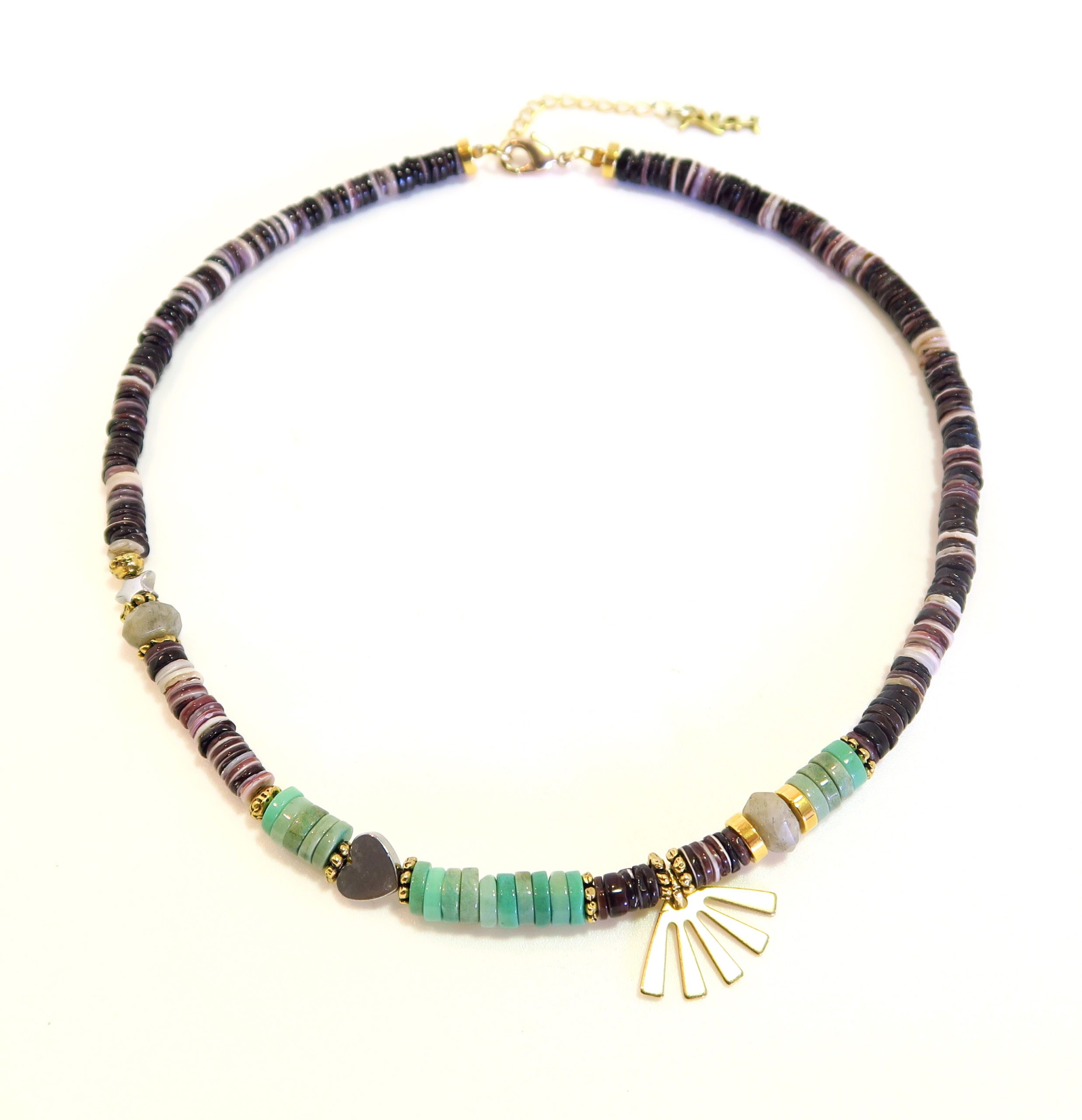 Ras de cou en rondelles de coquillage et pierres semi-précieuses.
