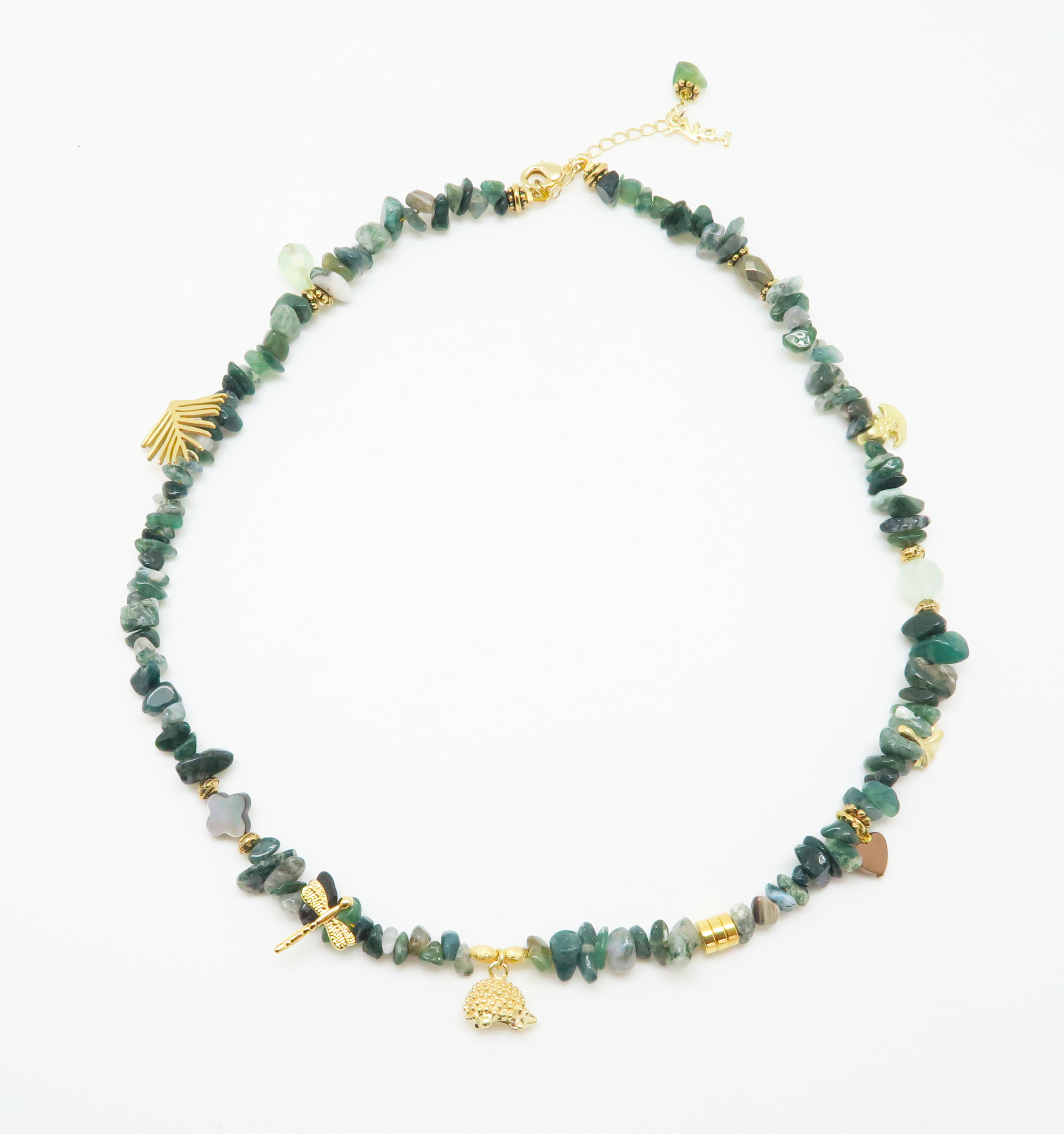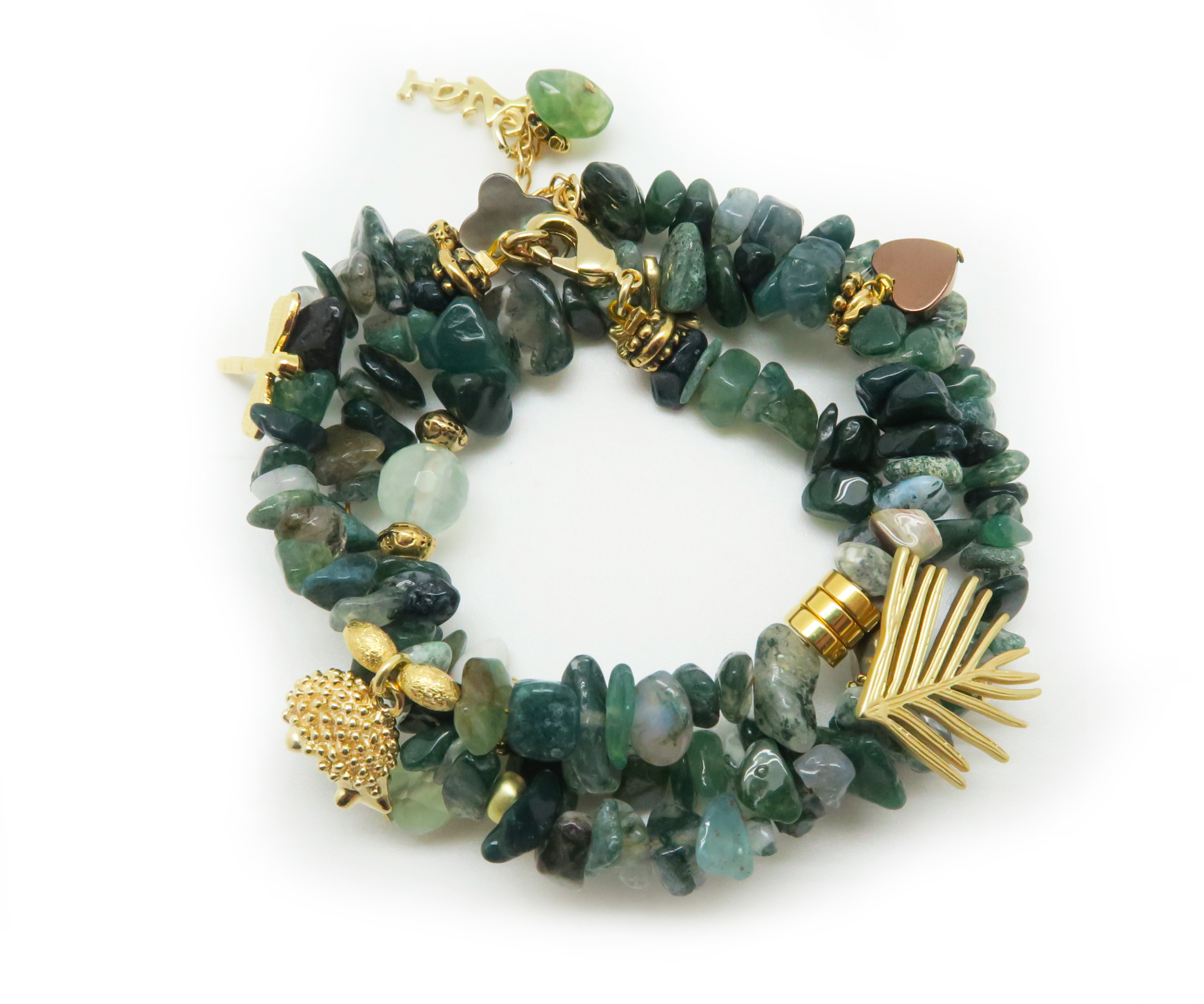 La pierre utilisée pour ce bracelet est de l’agate mousse et ses pampilles sont en nacre, quartz fumé, prehnite…