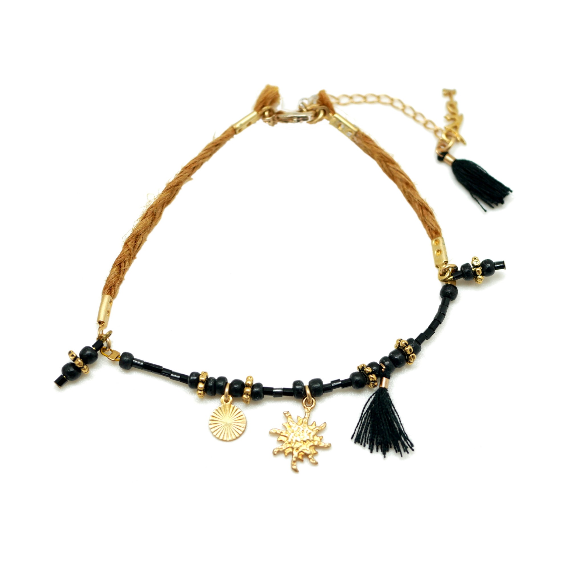 Chaine de cheville en corde avec perles japonaises, bois exotique et petits pompons.