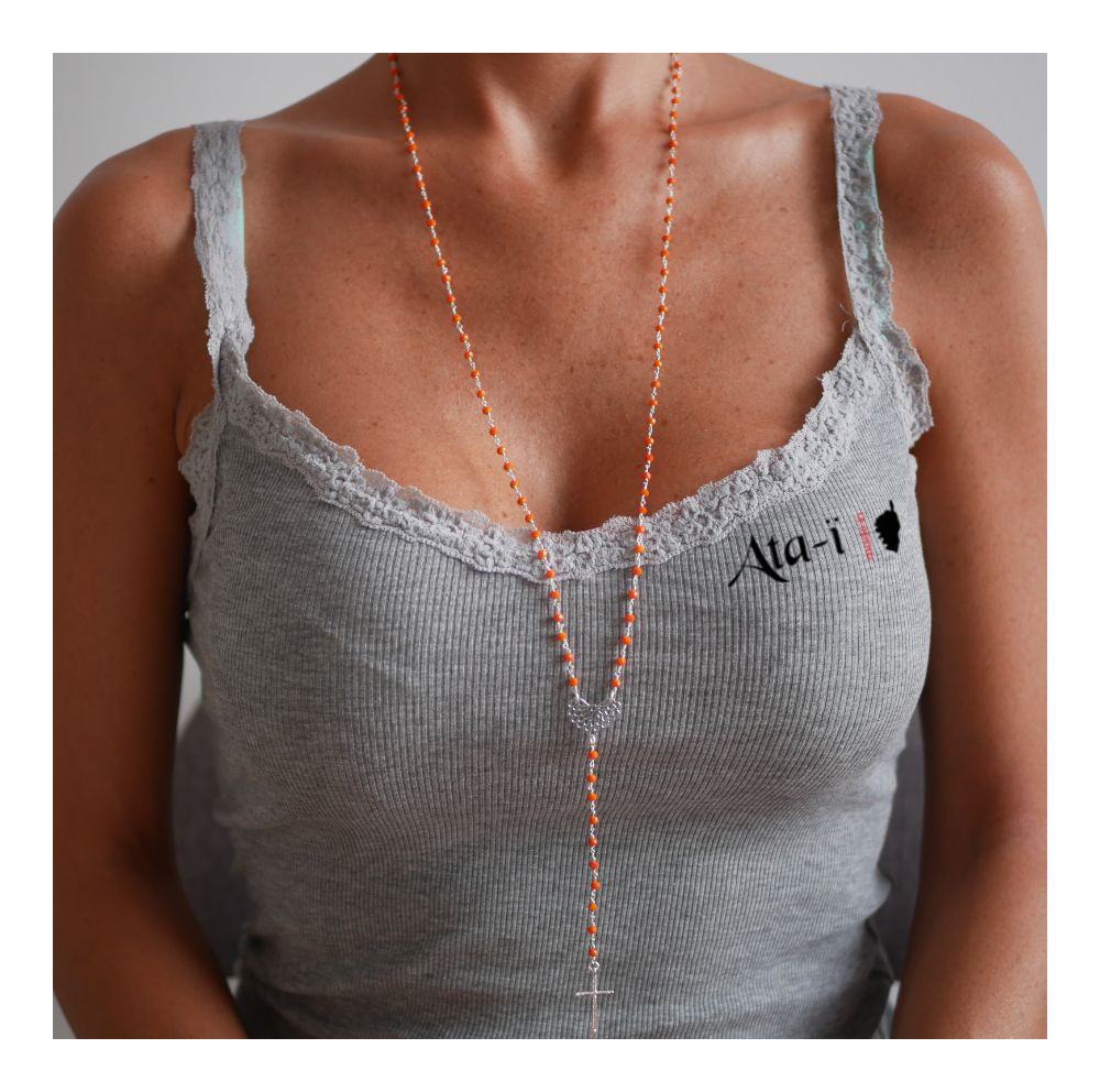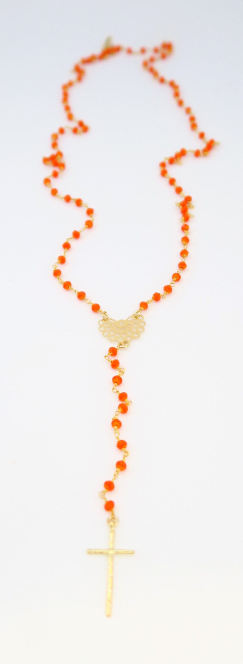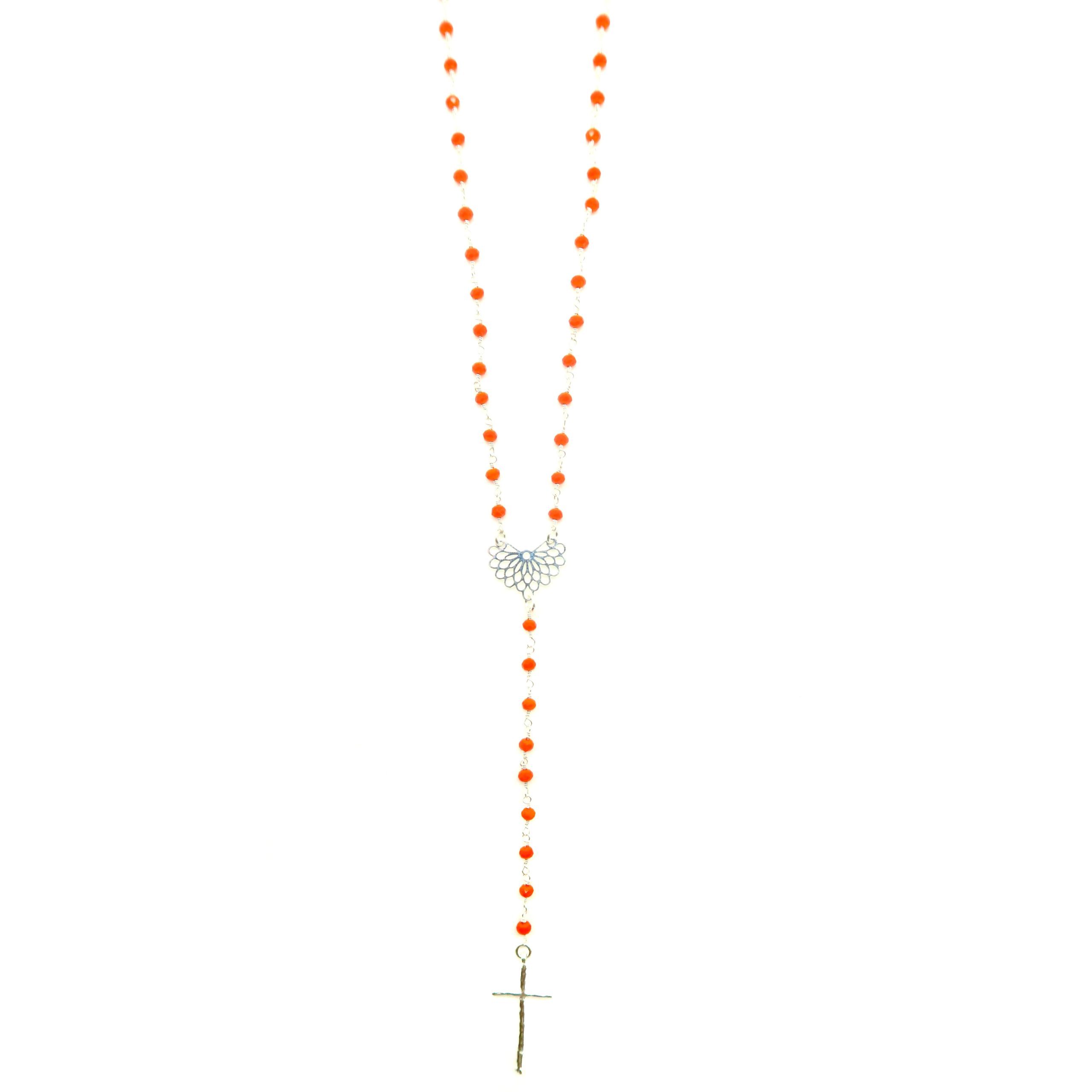 Sautoir façon chapelet avec perles en cristal avec croix ou feuille et pierre semi-précieuse.