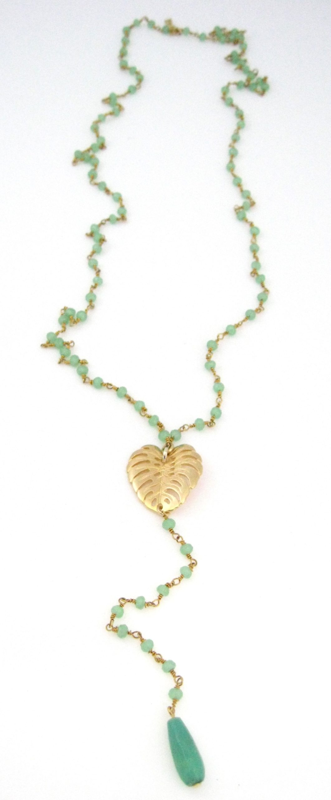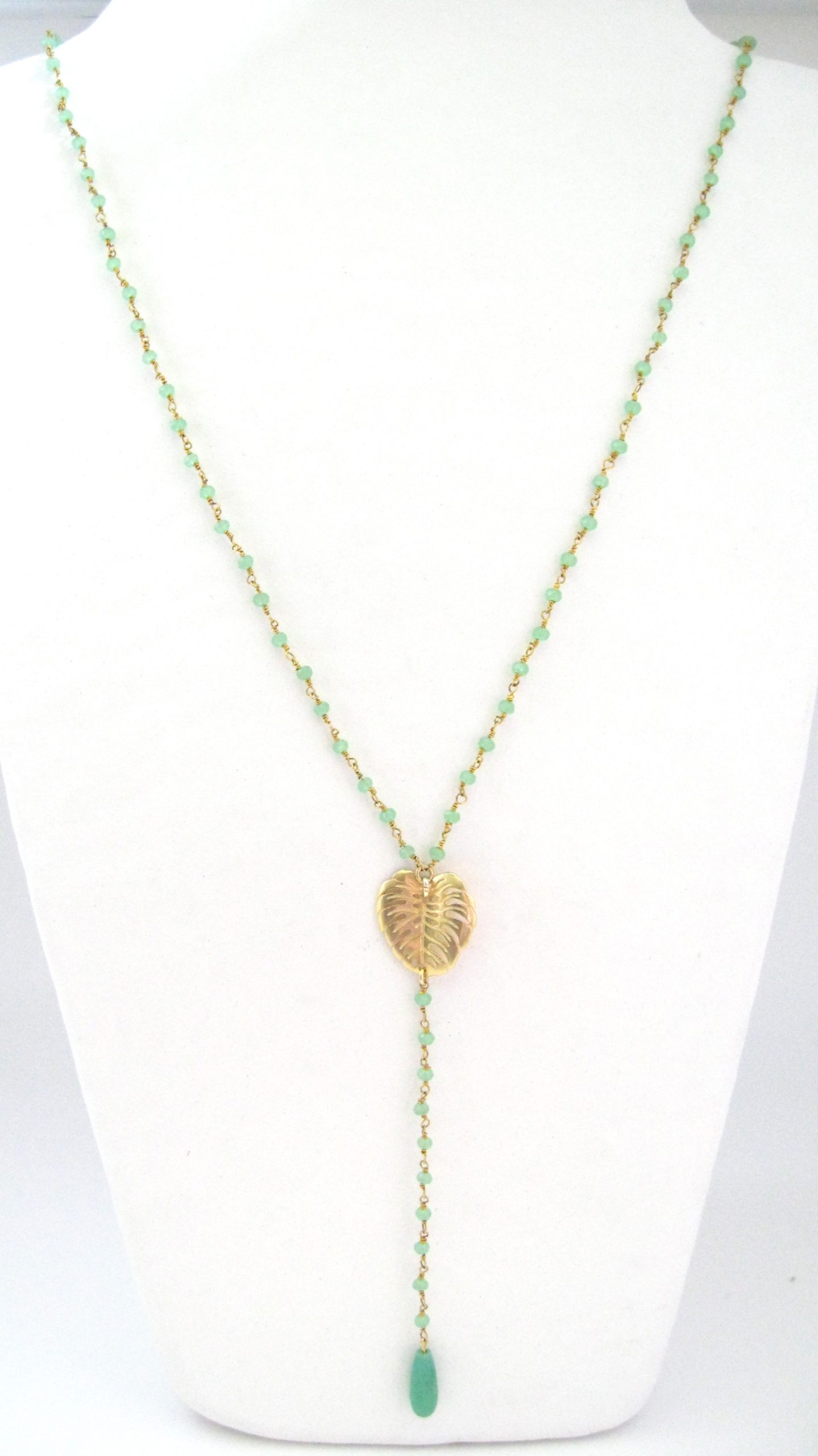 Sautoir façon chapelet avec perles en cristal avec croix ou feuille et pierre semi-précieuse.