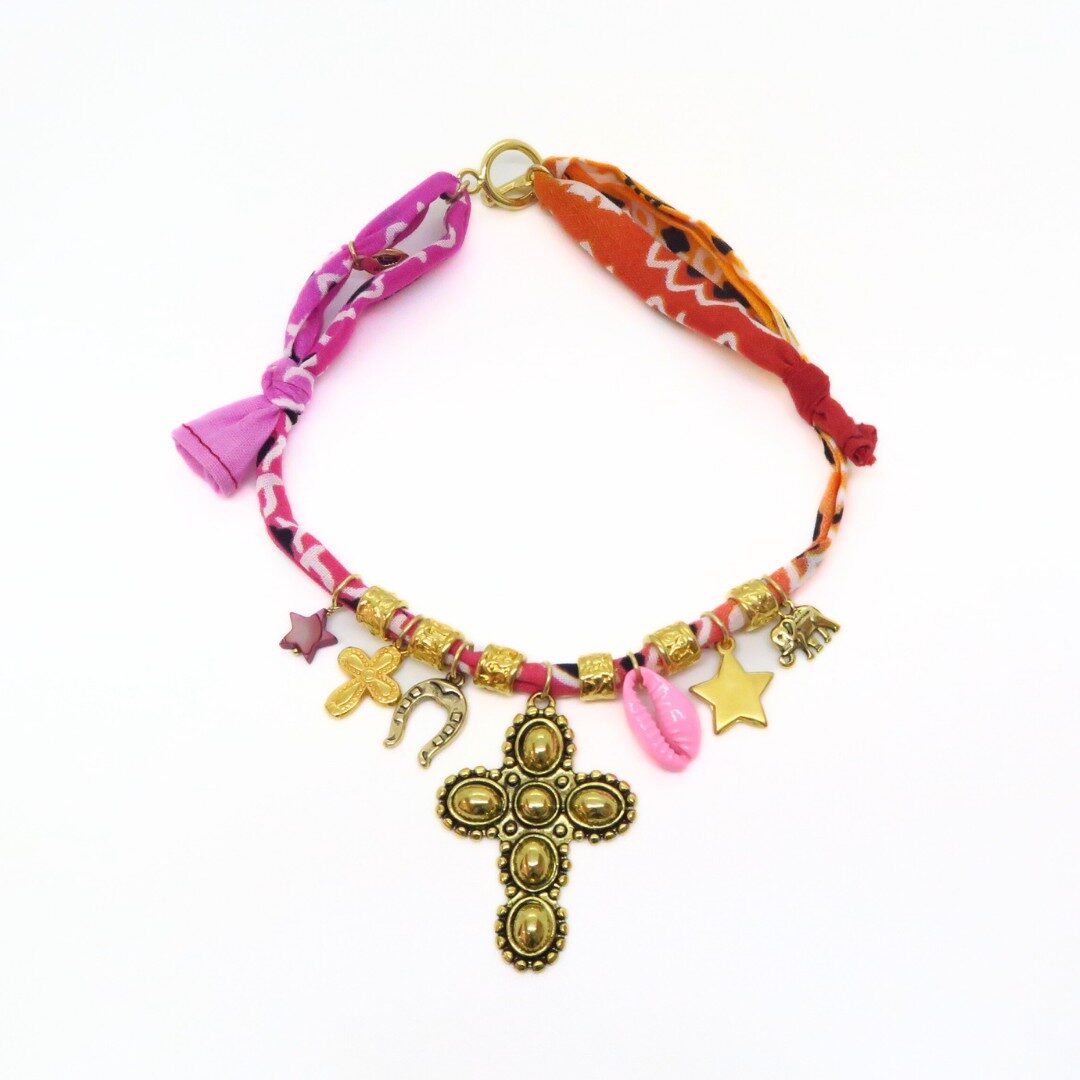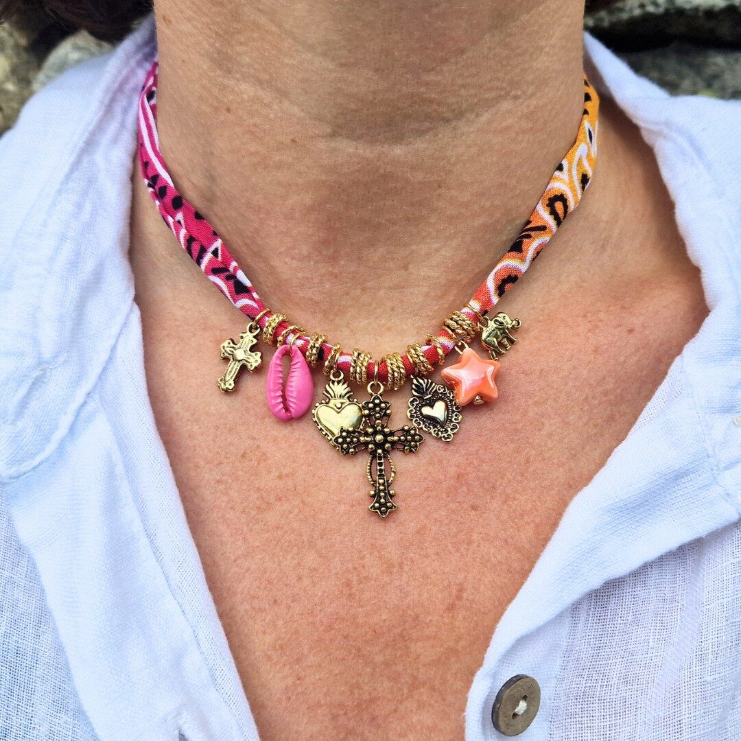 Collier ajustable en bandana avec pampilles porte-bonheur en métal doré, céramique, résine, nacre et cauris.