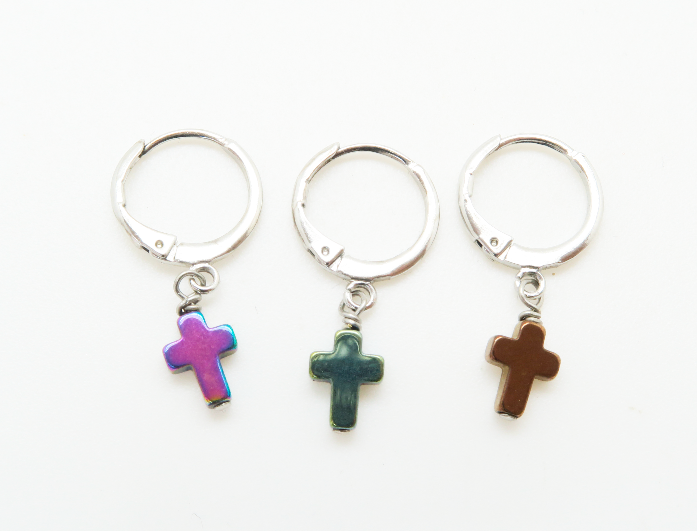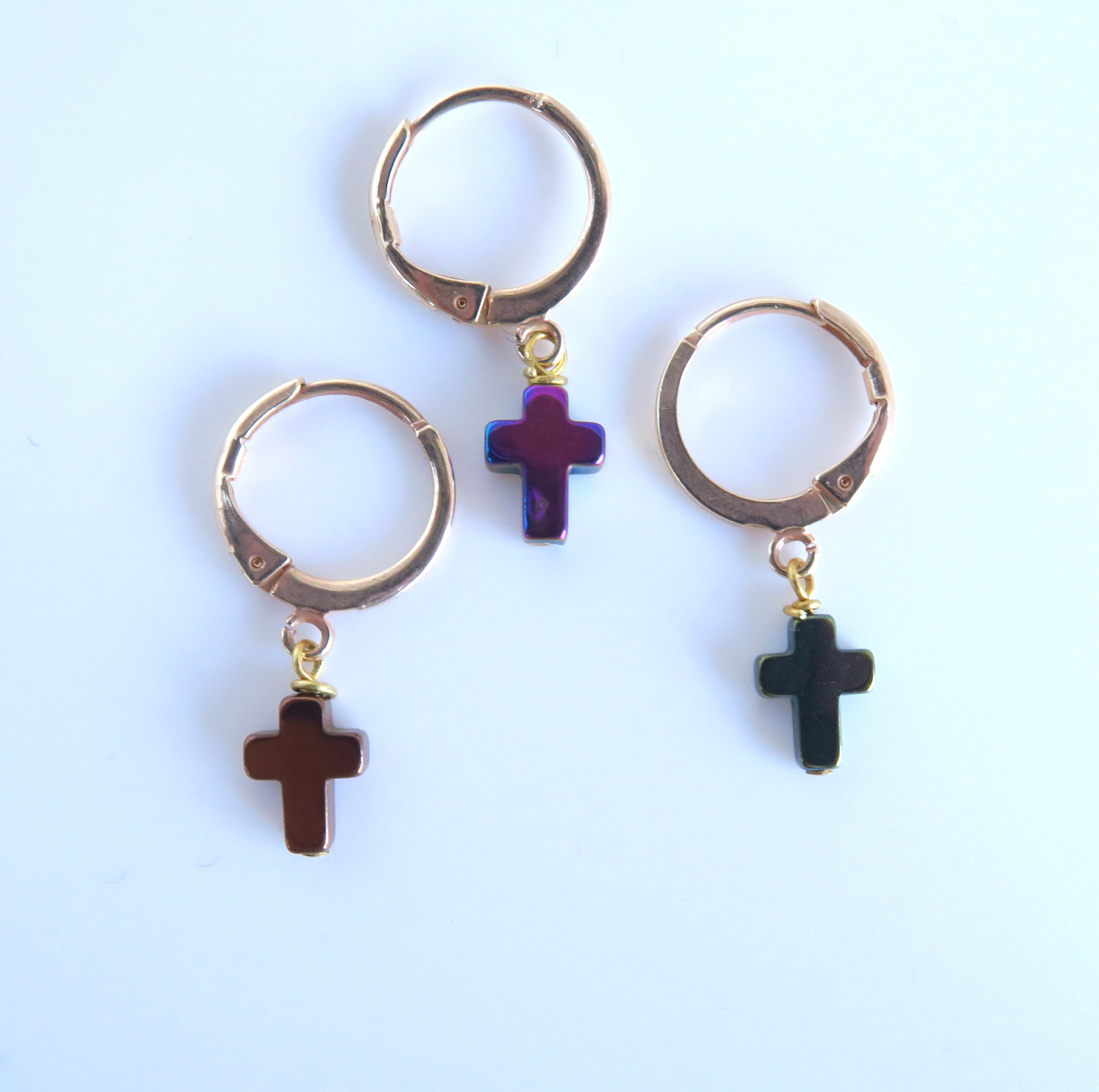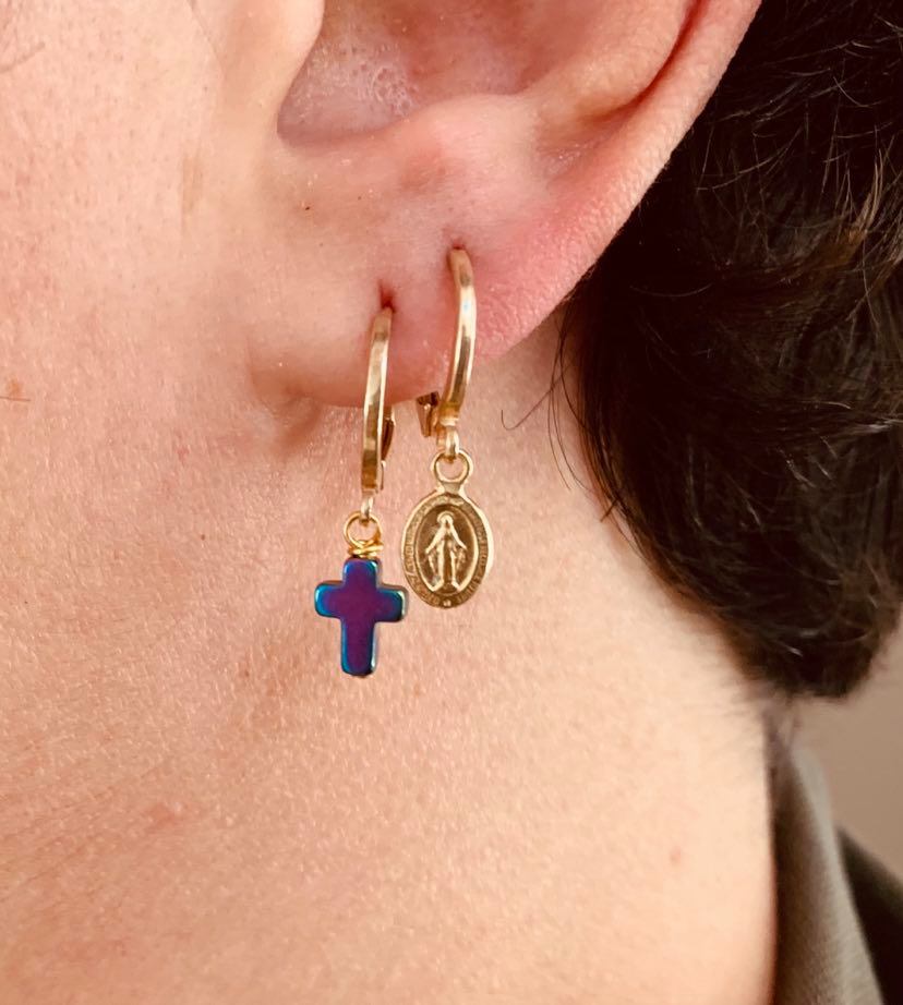 Créole en laiton doré ou argenté avec une croix en hématite. Trois couleurs au choix: mordoré, vert kaki, bleu électrique ou violet irisé.