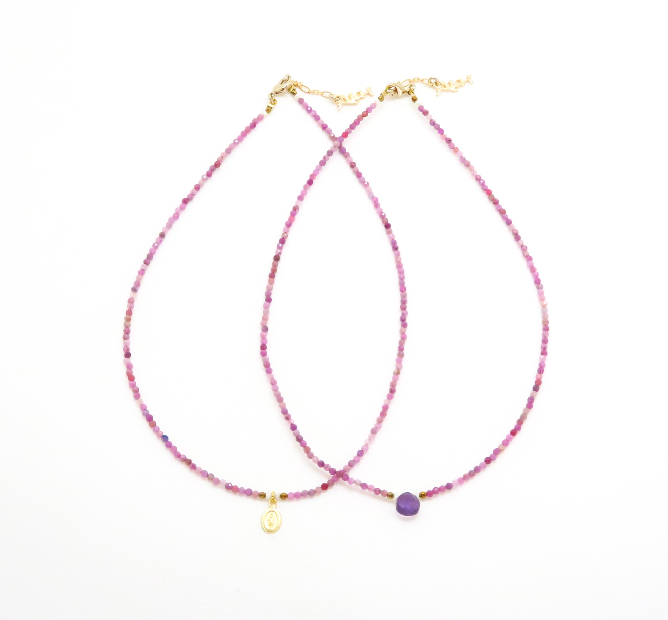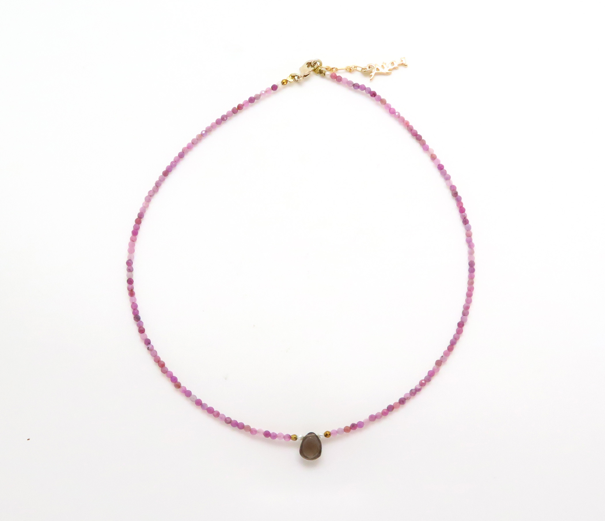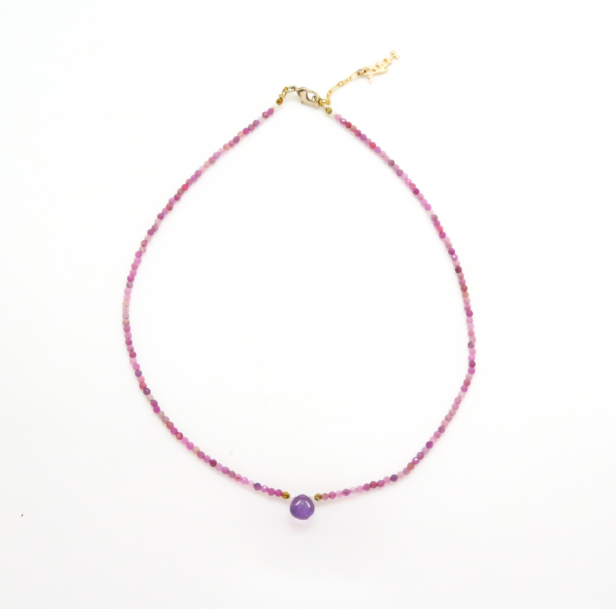 Ras de cou avec micro pierres semi-précieuses facettées et micro perles d’eau douce.