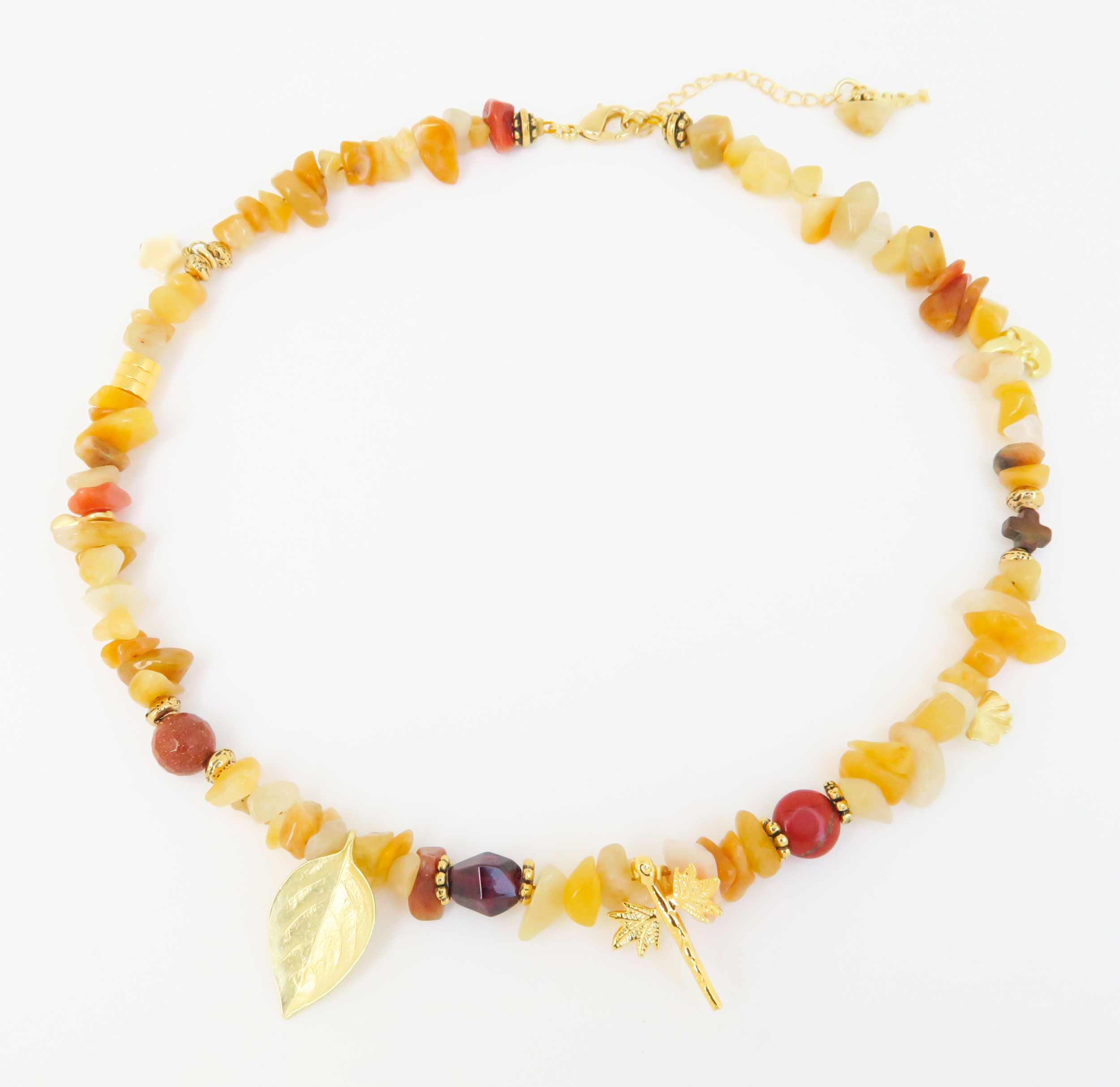 La pierre utilisée pour ce ras de cou est du jaspe jaune et les pampilles sont en nacre, grenat…
