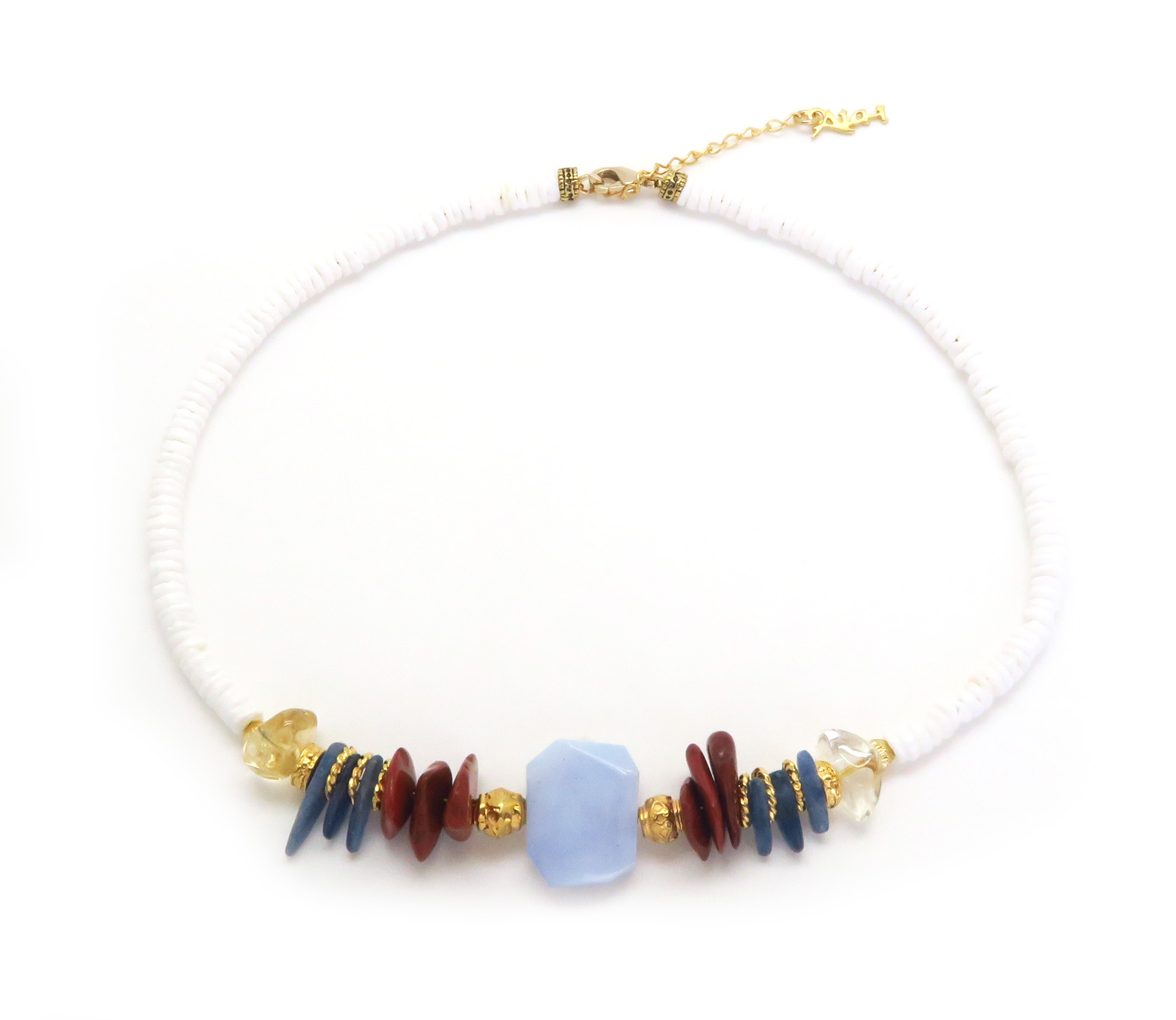 Collier ras de cou composé de rondelles de coquillage naturel et pierres semi précieuses : calcédoine, jaspe, cyanite et citrine.