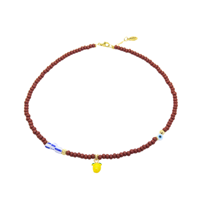 Collier ras de cou composé de perles en résine et d’un pendentif citron en émail.