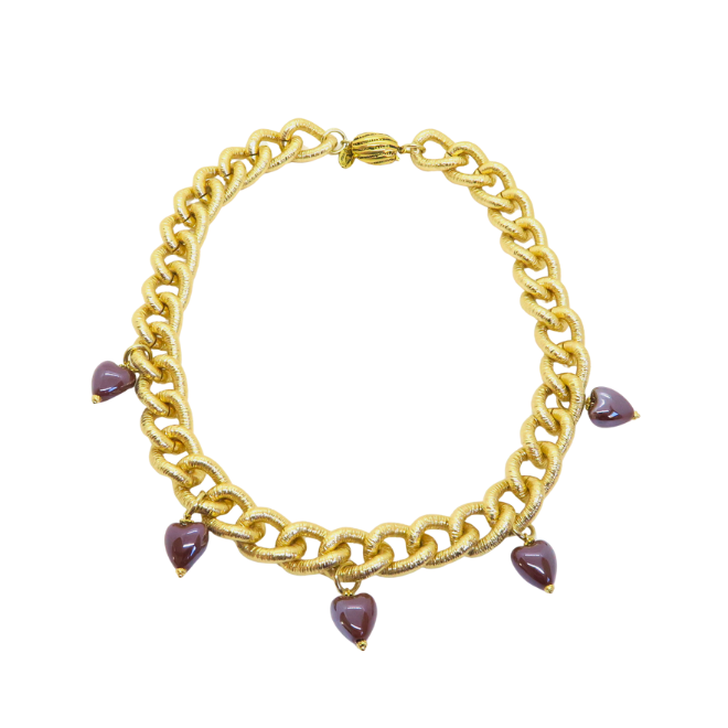 Collier ras de cou avec grande chaine dorée et cœurs en céramique.