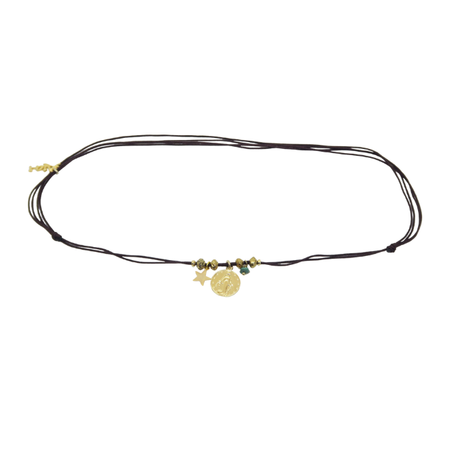 Collier cordon ajustable avec pierre semi précieuse (tourmaline ou turquoise) et médaillon au choix.