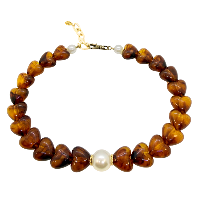Ras de cou avec cœurs ambre en résine et perles de culture fantaisie.