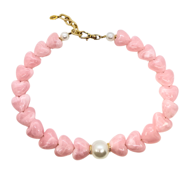 Ras de cou avec cœurs roses en résine et perles de culture fantaisie.