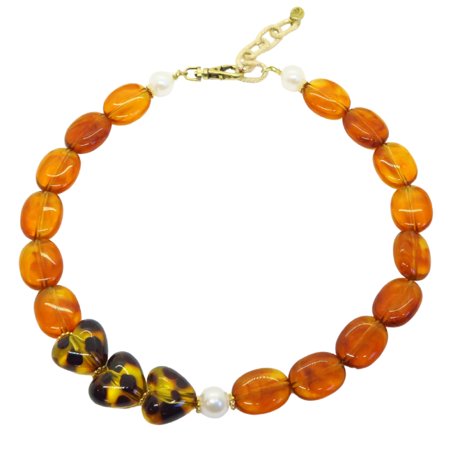 Ras de cou Gabrielle perles ambres et cœurs léopard