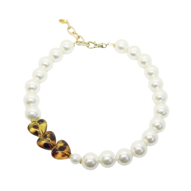 Ras de cou Gabrielle perles blanches et cœurs léopard