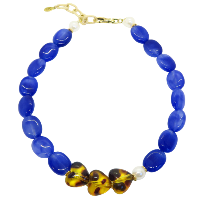 Ras de cou Gabrielle perles bleu royal et cœurs léopard