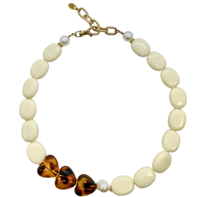 Ras de cou Gabrielle perles crème et cœurs léopard