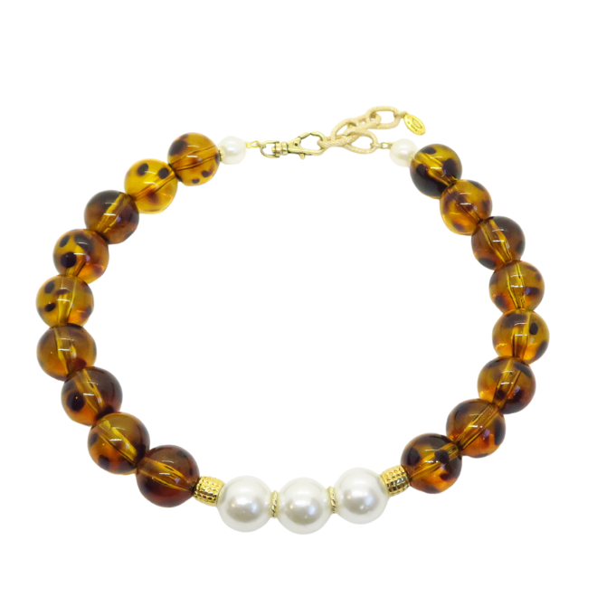 Ras de cou en perles de résine léopard et perles de culture fantaisie.