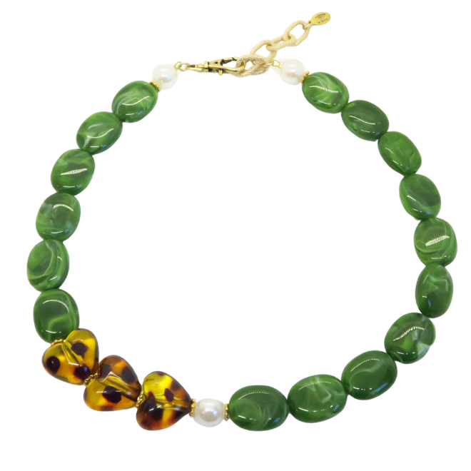 Ras de cou Gabrielle perles olives et cœurs léopard