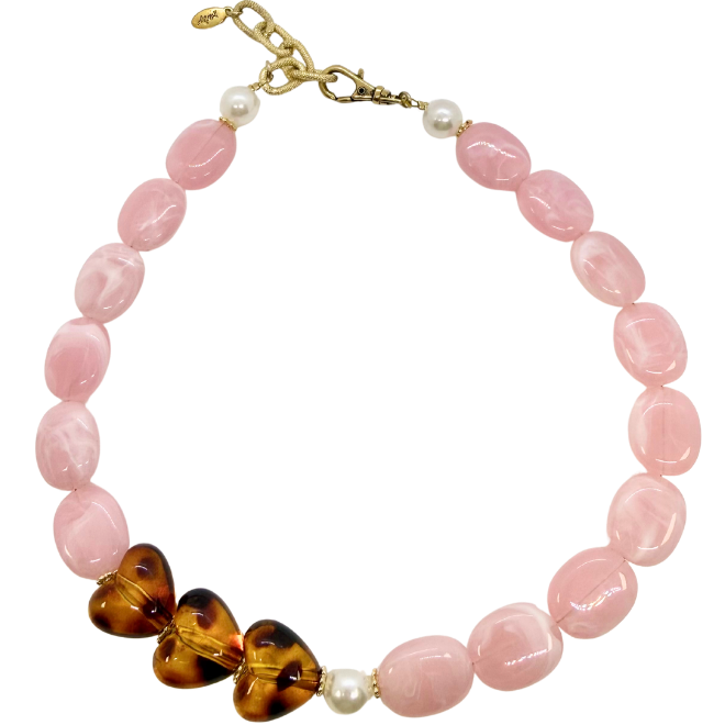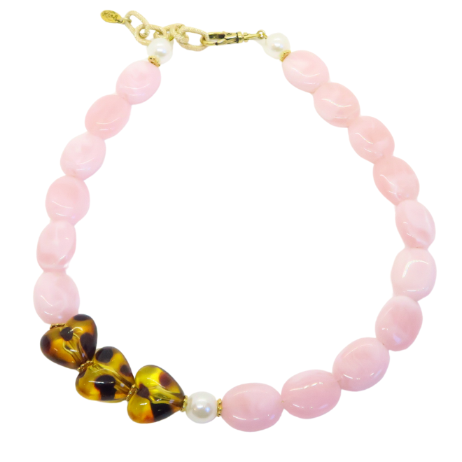 Ras de cou Gabrielle perles roses et cœurs léopard