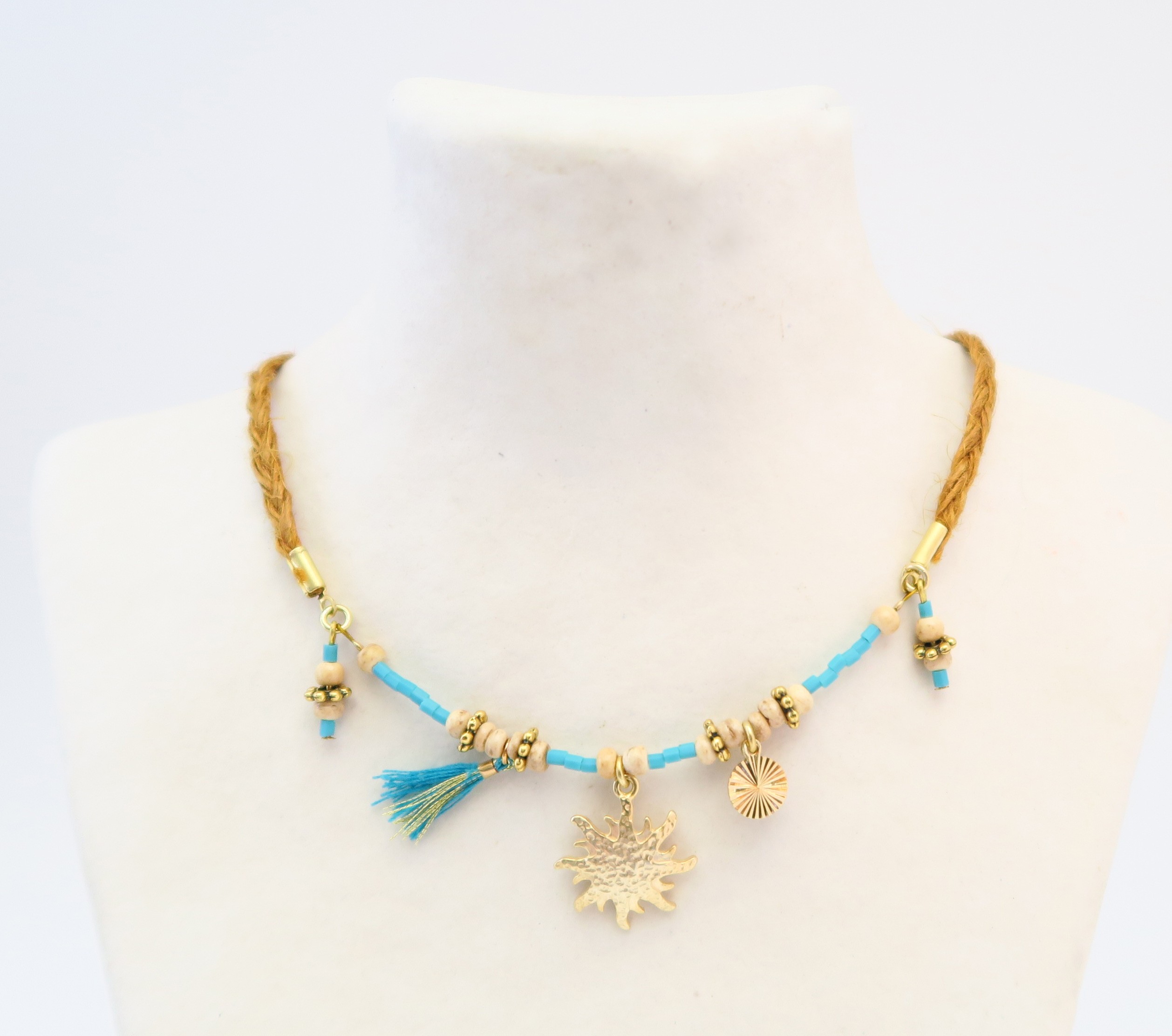 Ras de cou en corde de lin avec perles japonaises, bois naturel et petits pompons.
