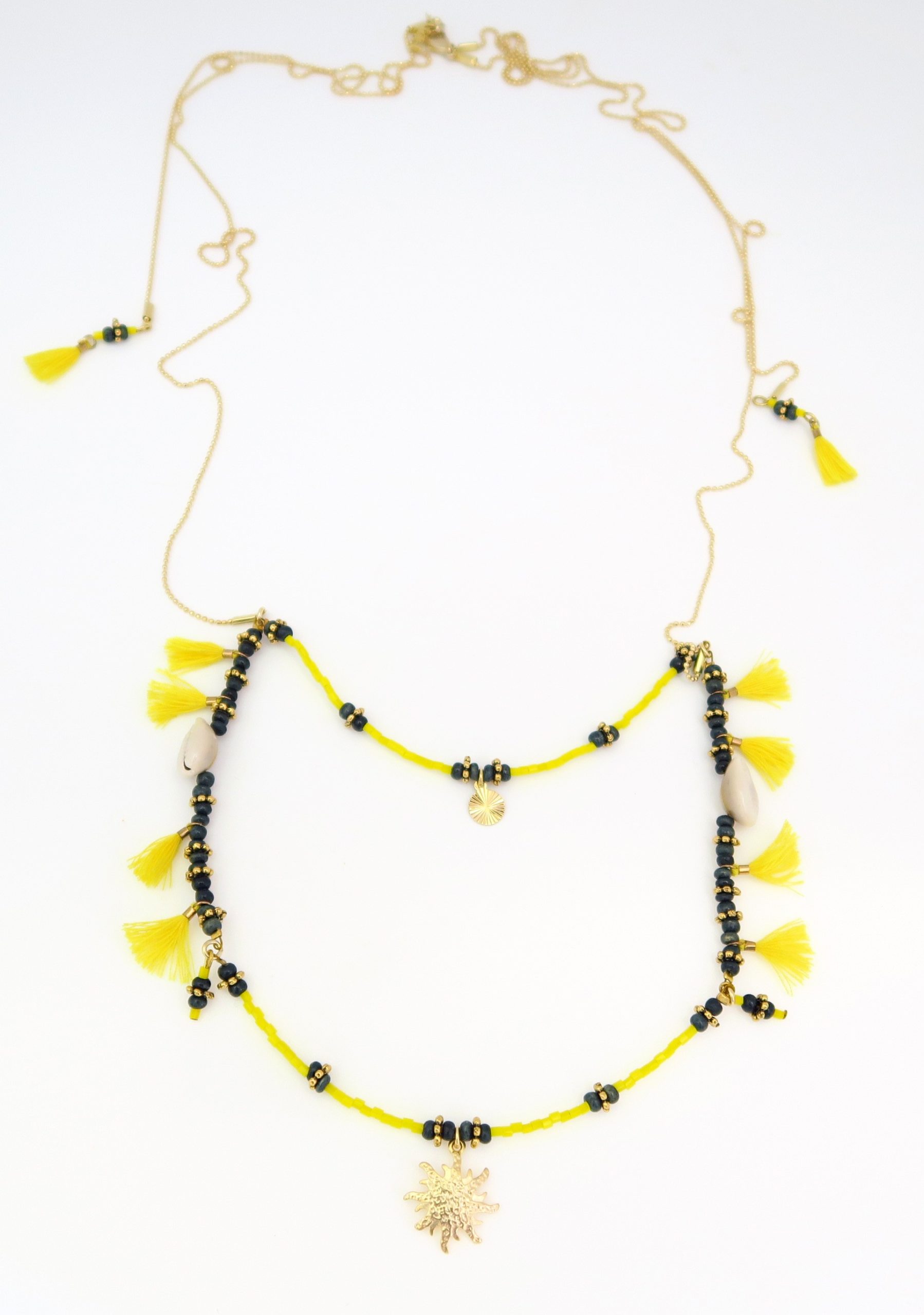 Sautoir avec bois, perles japonaises, pompons et coquillages. Les chainettes sur les côtés peuvent se porter dans un dos nu ou sur un décolleté.