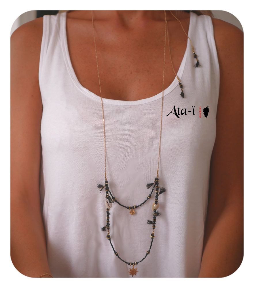Sautoir avec bois, perles japonaises, pompons et coquillages. Les chainettes sur les côtés peuvent se porter dans un dos nu ou sur un décolleté.