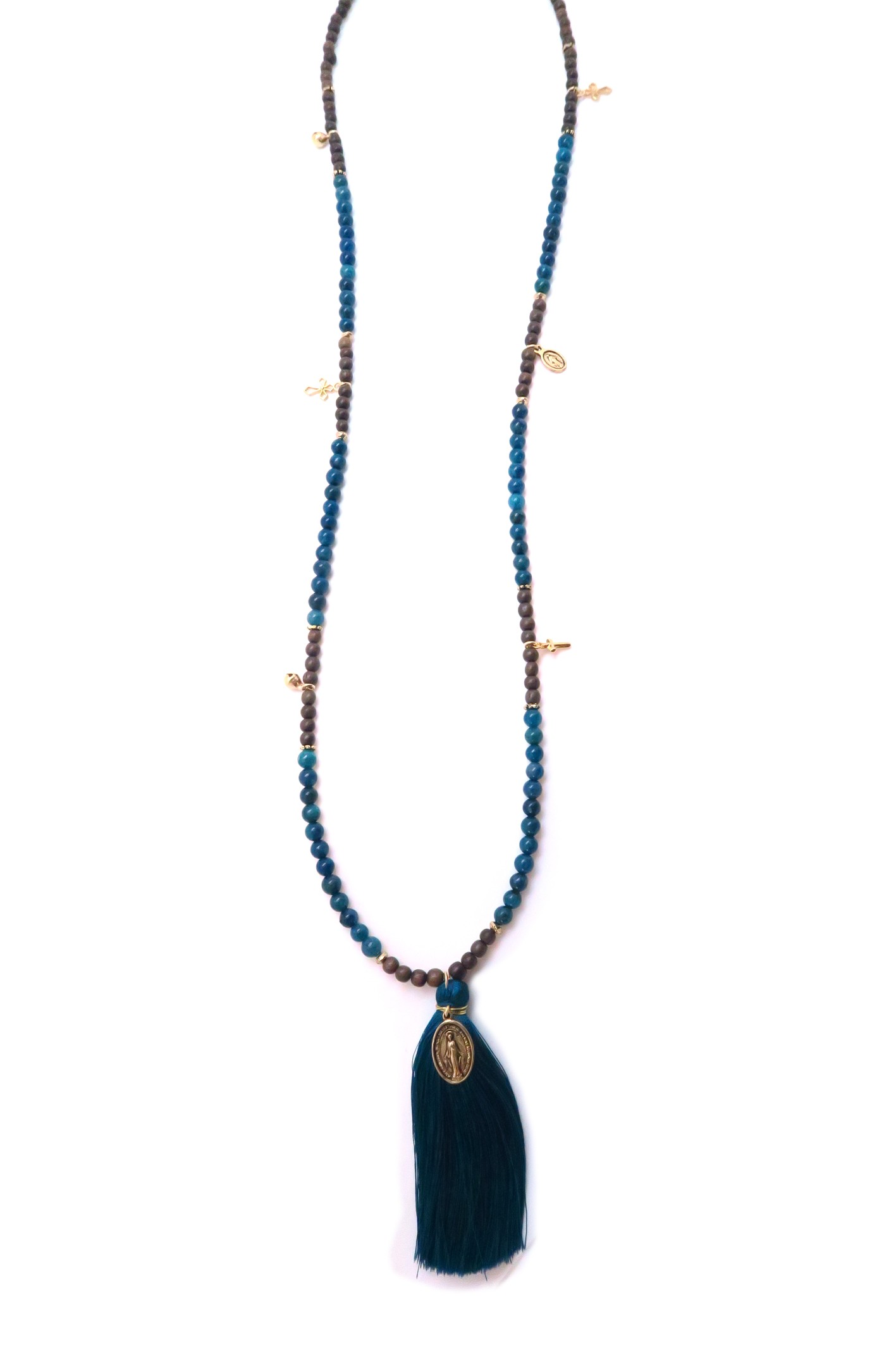 Sautoir avec pierres semi-précieuses, bois, pendentifs et grand pompon. Longueur : 54 cm avec pompon.