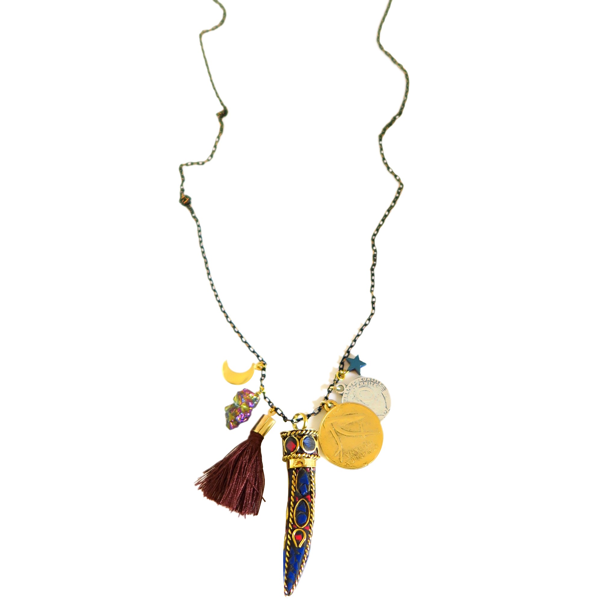 Chaine noire et dorée, avec pampilles en métal doré et argenté. Grande corne marine avec inscrustation de pierres semi-précieuses. Pompon chocolat.