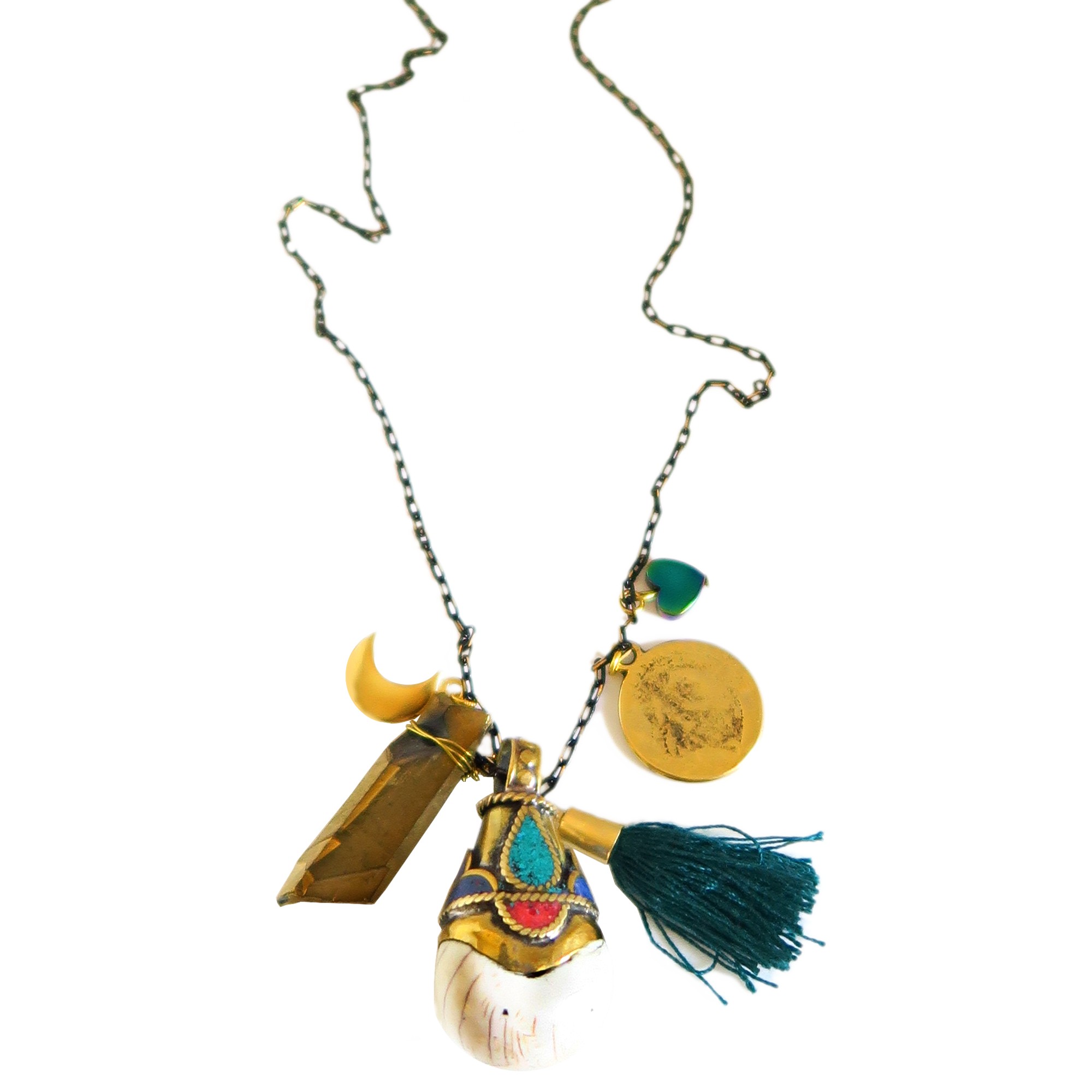 Chaine noire et dorée, avec pampilles en métal doré et argenté. Goutte blanche avec incrustation de pierres semi-précieuses. Pompon vert canard.
